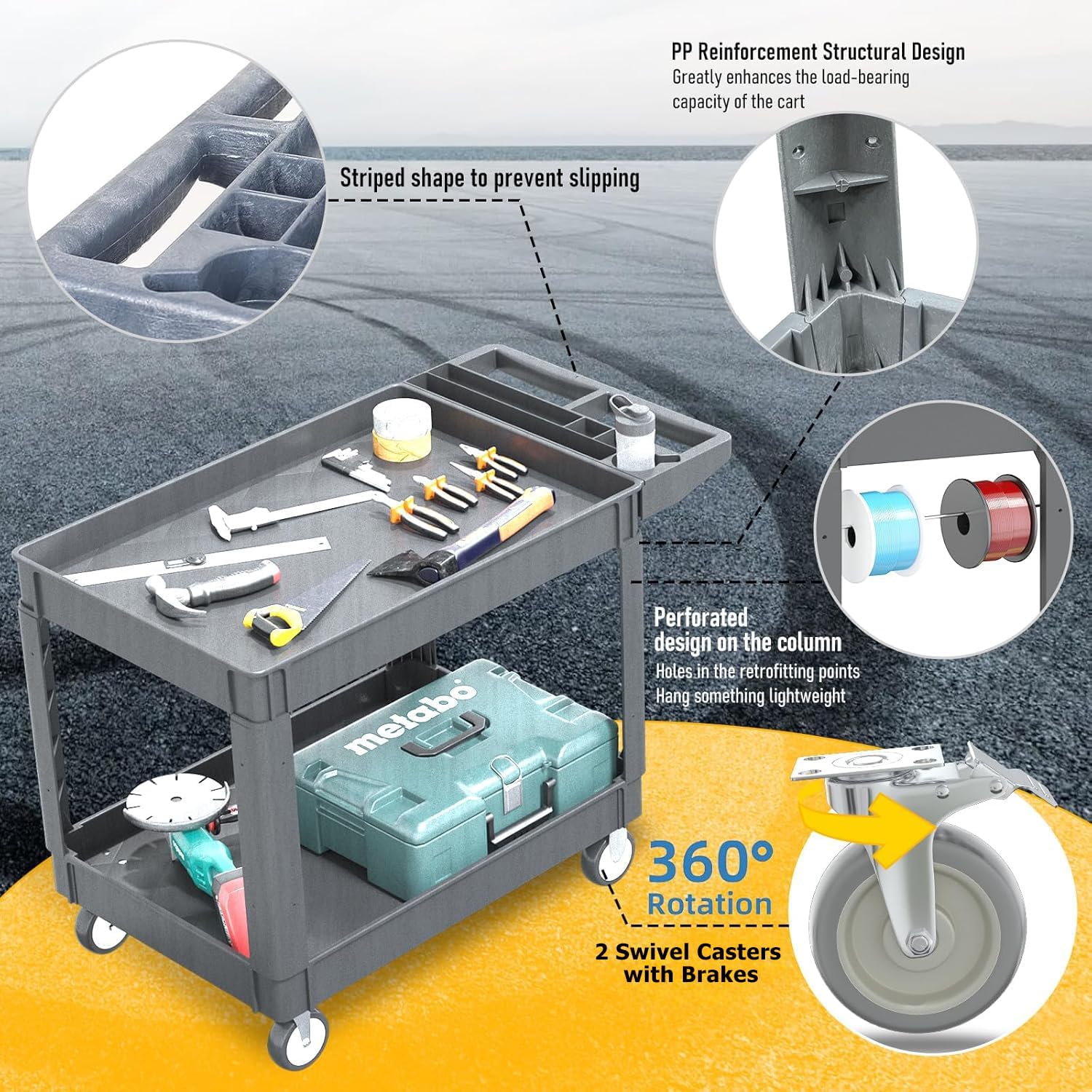 2 Tier Rolling Utility Cart on Wheels, 1000 lbs Capacity Plastic Service Cart with Lipped Shelves, 46 x 26-Inch Heavy Duty Work Cart for Warehouse, Garage, Cleaning, Gray