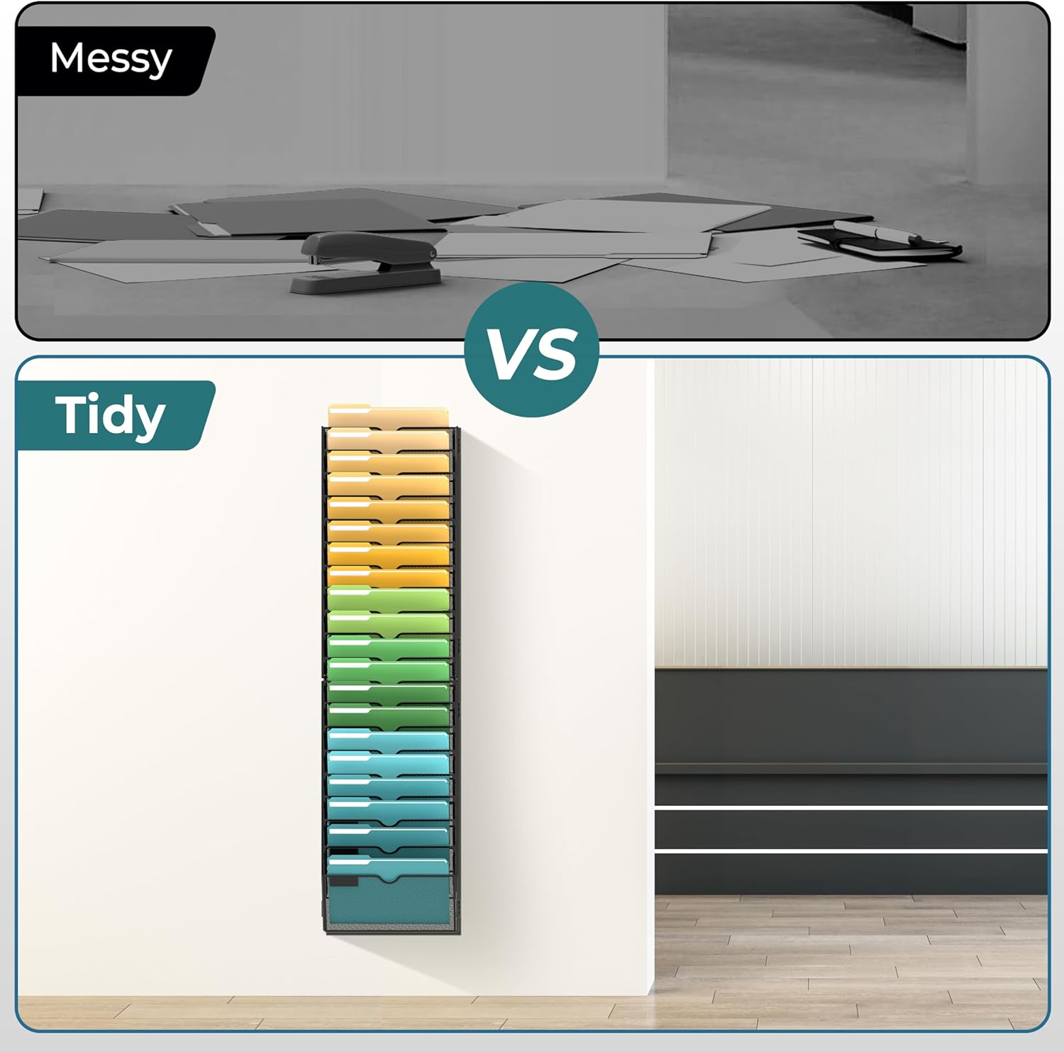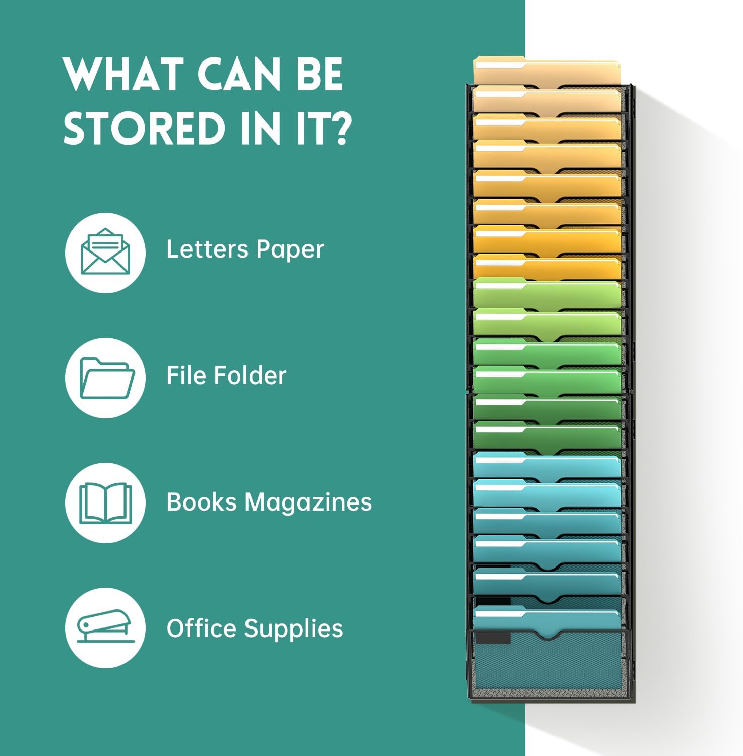 - [Optimized Space Utilization] With 20 cascading slots, this wall file organizer provides ample space for your office files, accommodating letter-size charts, files, notebooks, and more.