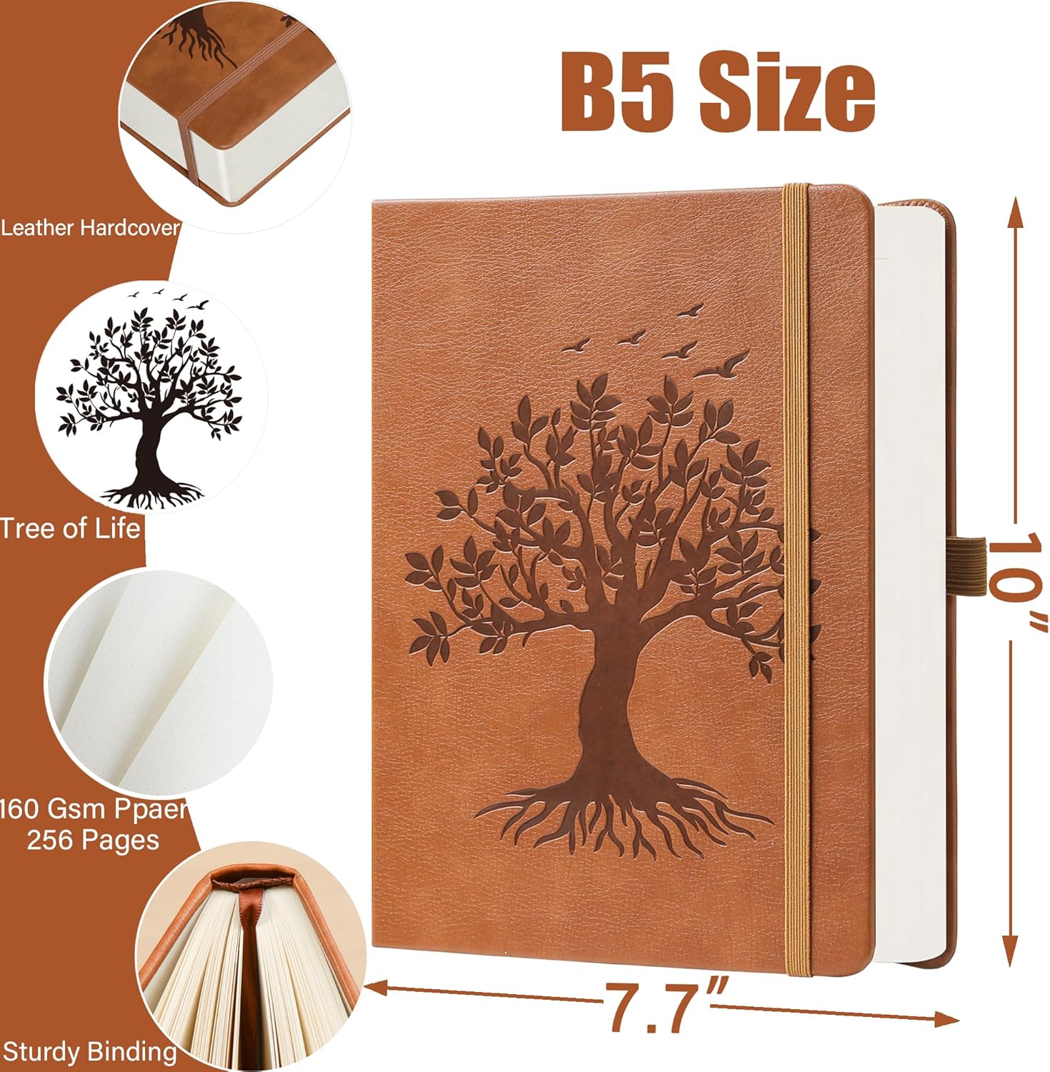 ZXHQ B5 Bullet Dotted Journal Notebook:150 gsm Thick Paper, 256 Pages, Dot Grid Hardcover, Tree of Life Design, Fine Inner Pocket - 7.7" × 10" Brown
