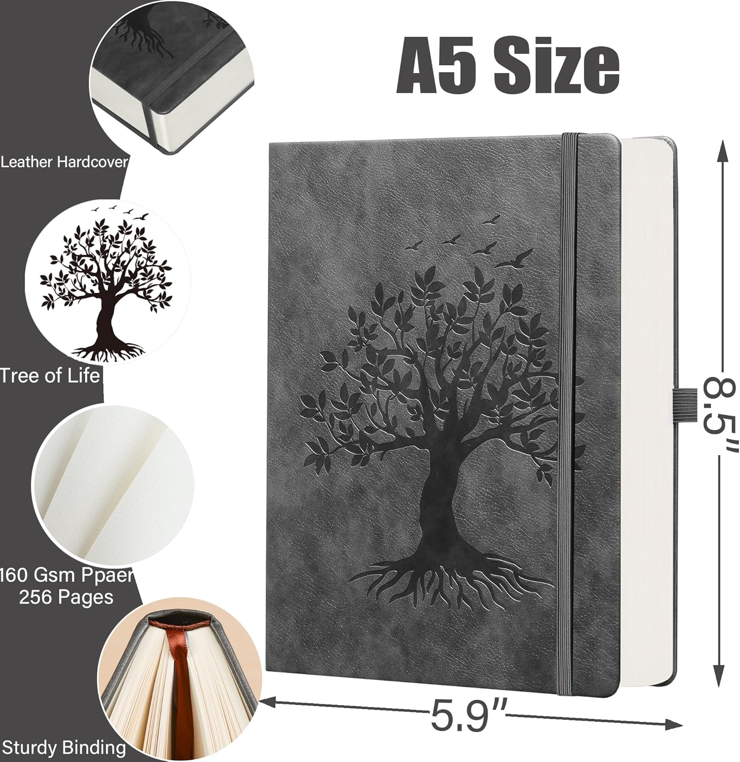 ZXHQ A5 Bullet Dotted Journal Notebook - 150gsm Thick Paper, 256 Pages, Dot Grid Hardcover, Tree of Life Design, Fine Inner Pocket - 5.9" × 8.5" Dark Grey