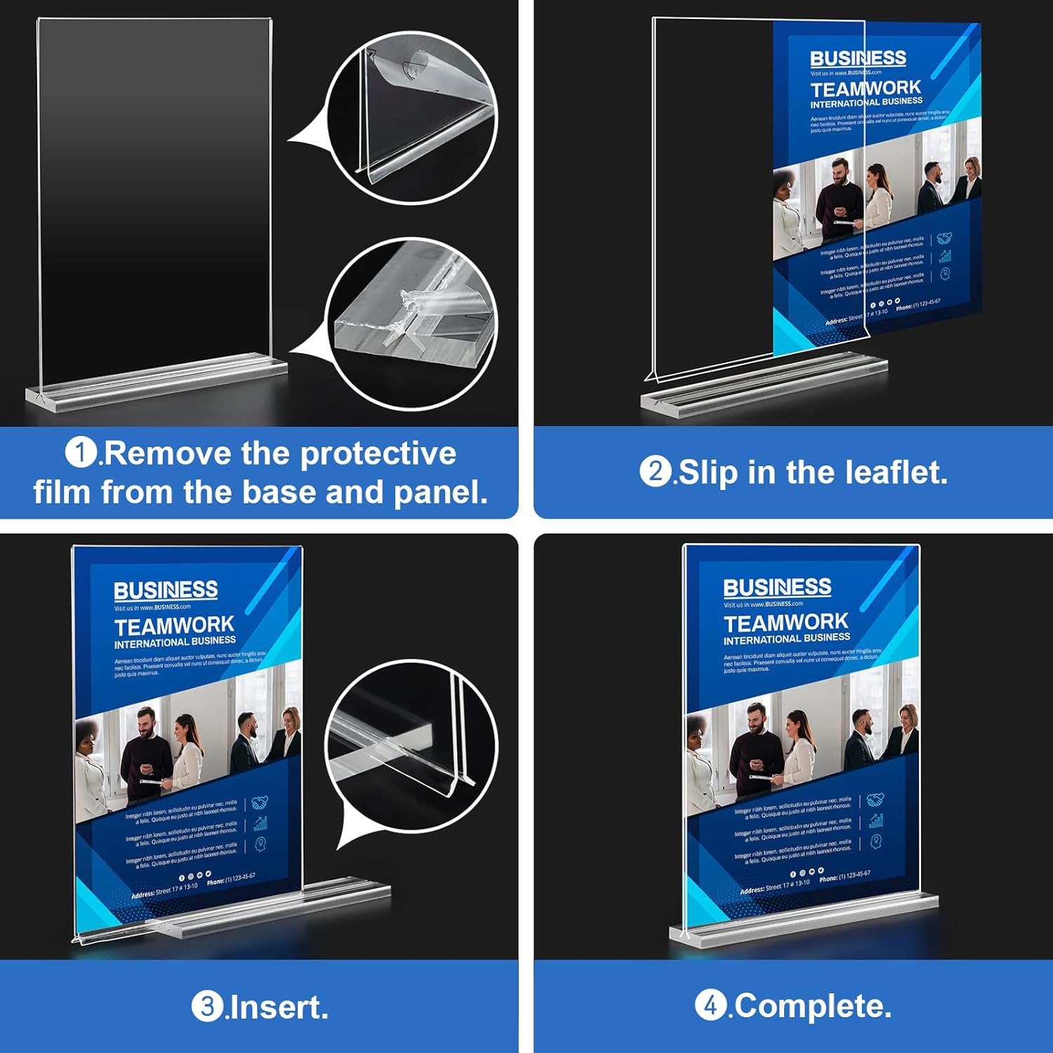 - 【Vertical T-shaped Base】Acrylic sign holder will securely stand by itself vertically on any countertop, desktop, or tabletop with its vertical T-shaped base. It will never fall over. Gently pull out the base, swap out the picture inside the sign rack, then you can display the pictures you want