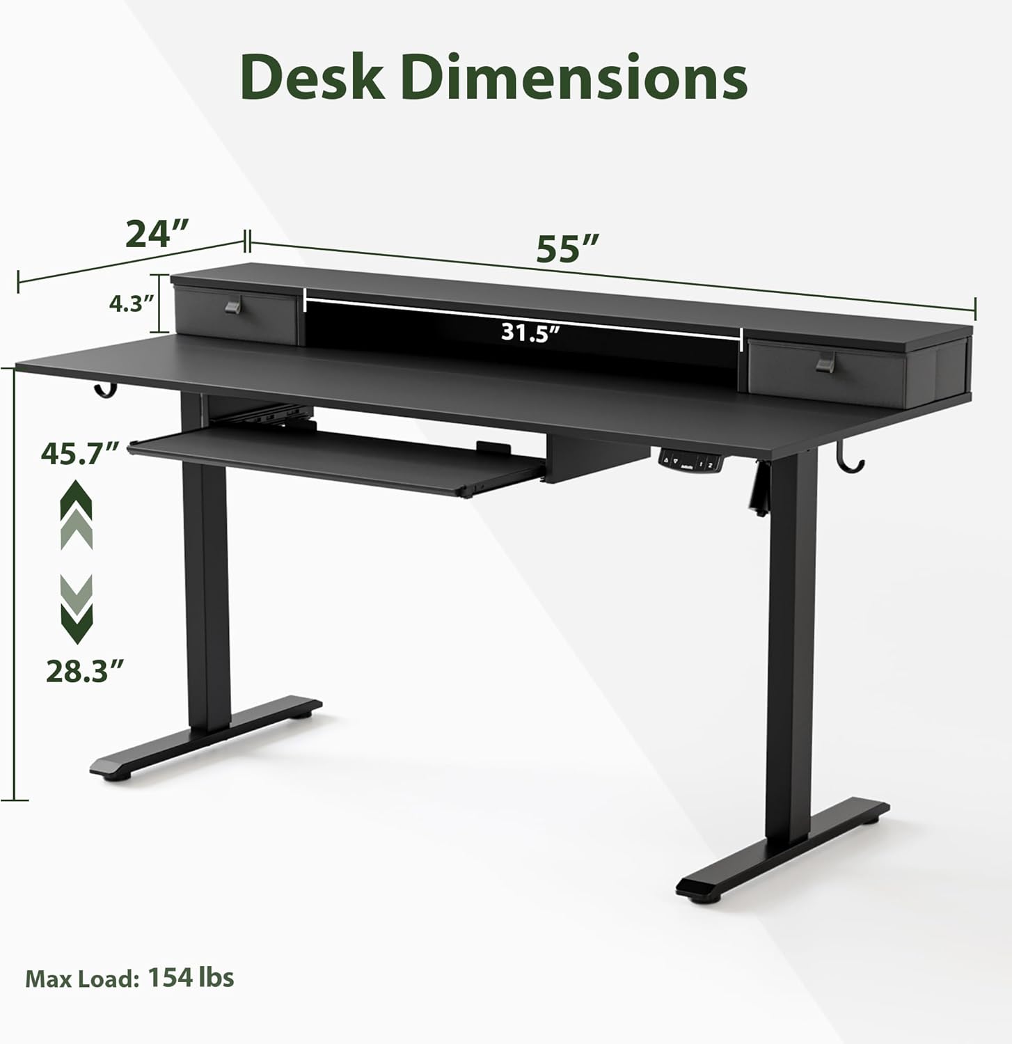 Agilestic Electric Standing Desk with 2 Drawers and Keyboard Tray, 55 x 24 Inches Ergonomic Adjustable Height Desk with Storage, Sit Stand up Desk Computer Workstation, Black