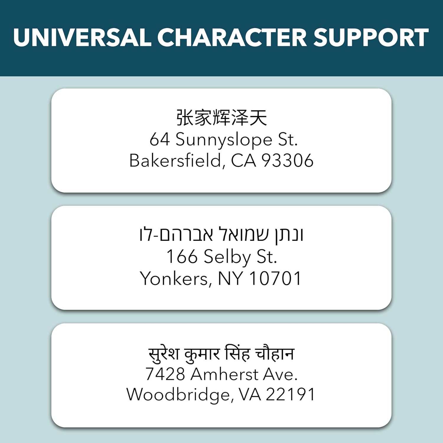 - UNIVERSAL CHARACTER SUPPORT - We support all foreign and English characters, allowing you to personalize each label with your unique name and address, no matter the language.