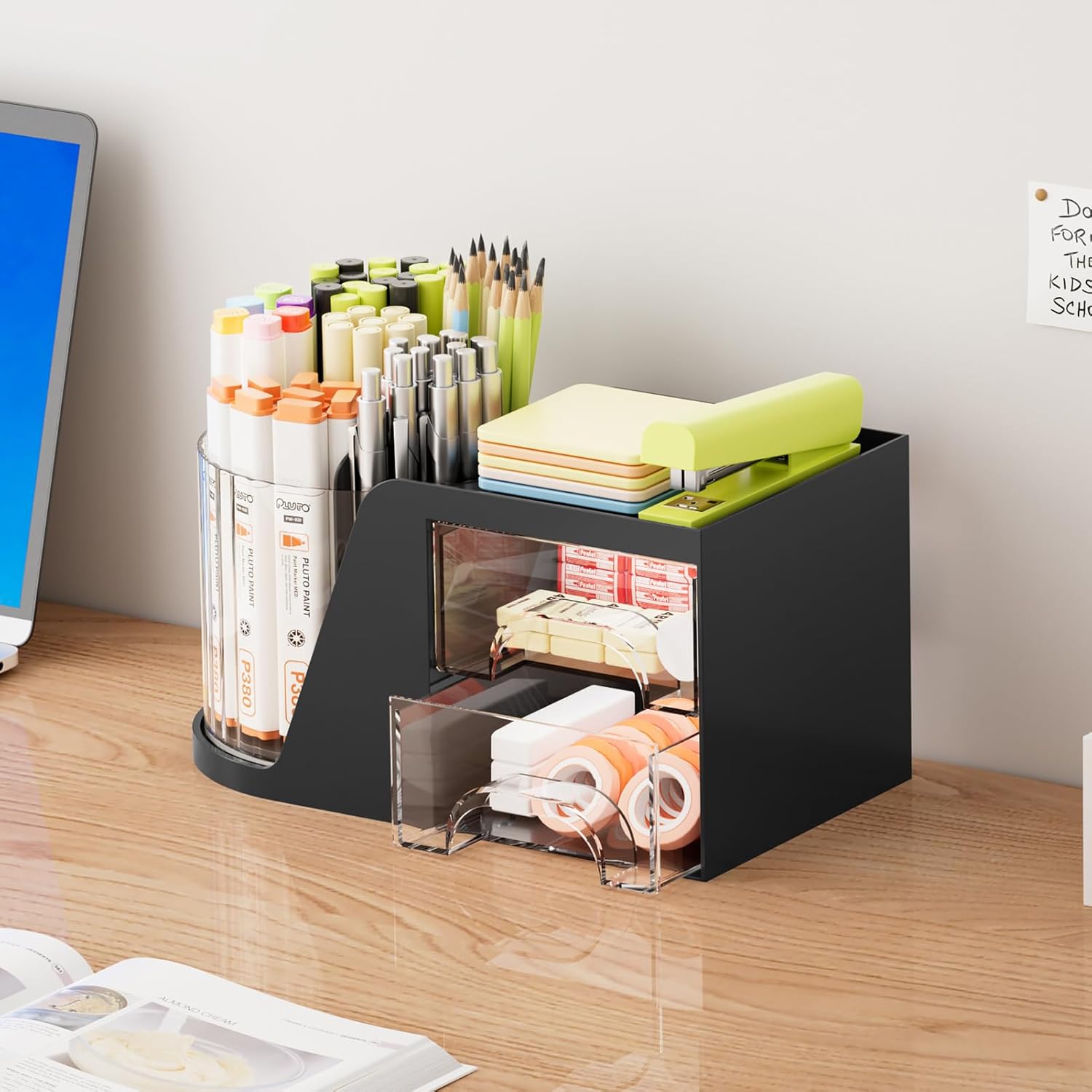 Marbrasse Desk Organizer with 2 Drawer, 360°Rotating Pen Holder, Desk Organizers and Accessories with 6 Slots Pencil Holder + 2 Drawer, Art Supply Storage Box Caddy for Office (Black)