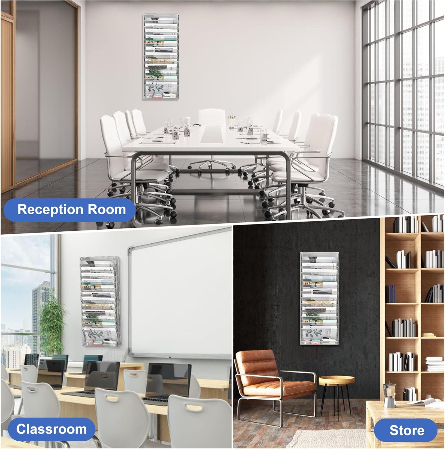 - All-in-One Mail Center: Mail organizer wall mounted stores A4 files, catalogs, outgoing mail. Doubles as brochure display for clinics/workshops. Converts clutter to order.