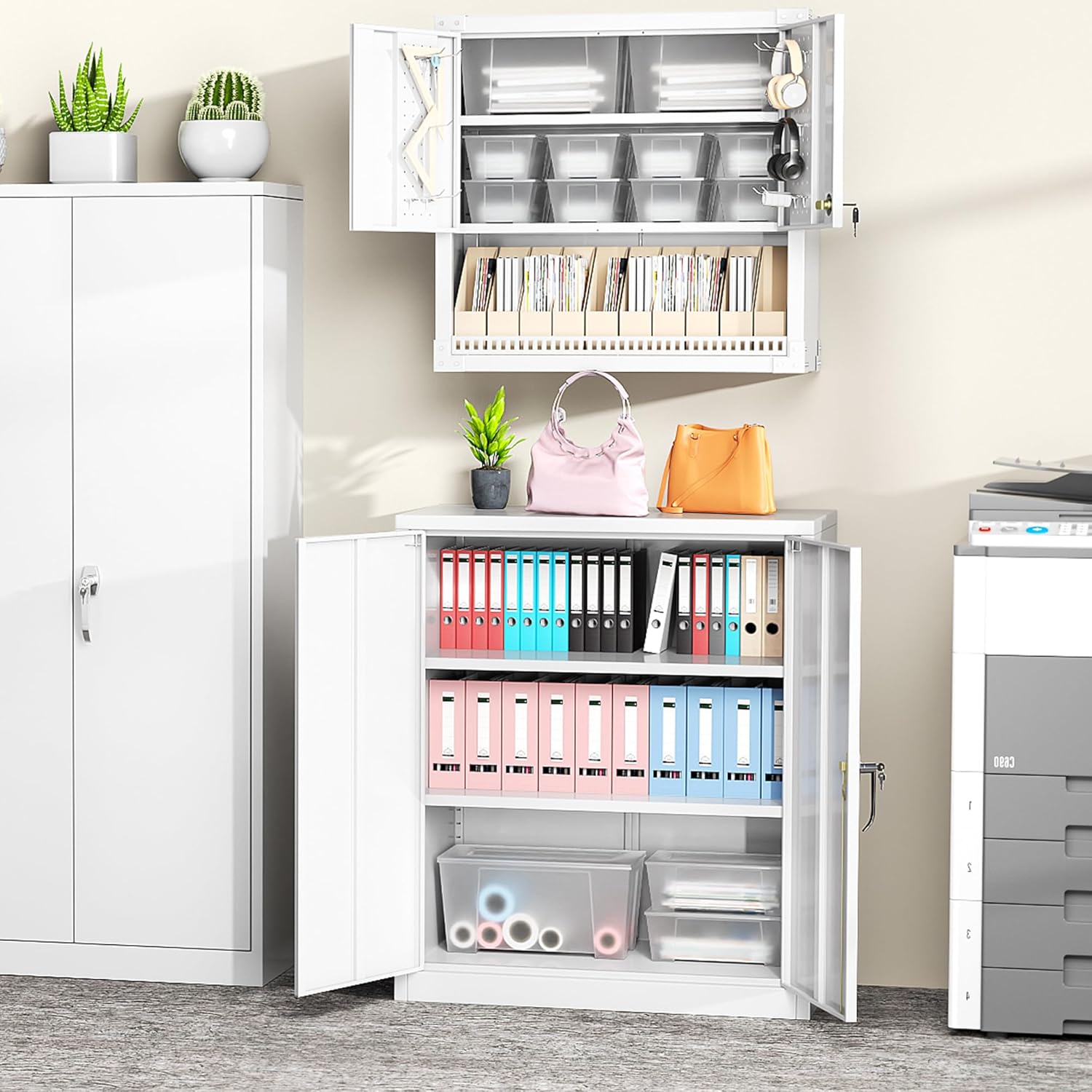 - [Excellent Security&Convenience]:Greenvelly metal garage storage cabinet provide 2keys,3-point locking system to protect your valuables ,in addition With the silver handle, the overall design feels simple and modern.The operation mode of locking and unlocking is very simple and convenience.Small lockable file locking counter cabinet also equip pre-hole for fixing to bring safety and convenience.