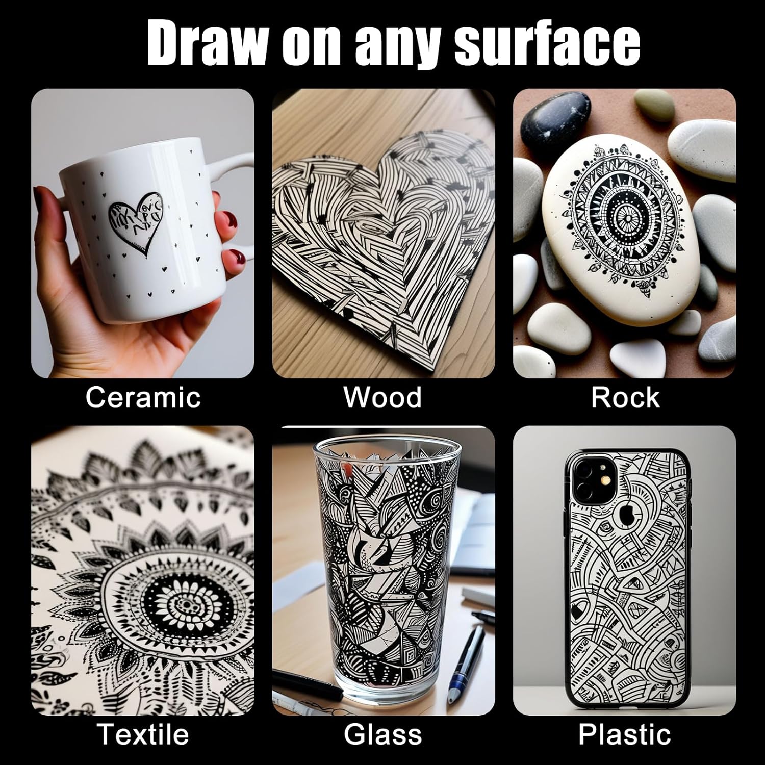 - Multi-Surface: These amazing paint pens work on a variety of surfaces including rocks, ceramics, wood, paper, fabric, plastic, canvas, stone, glass, metal and more