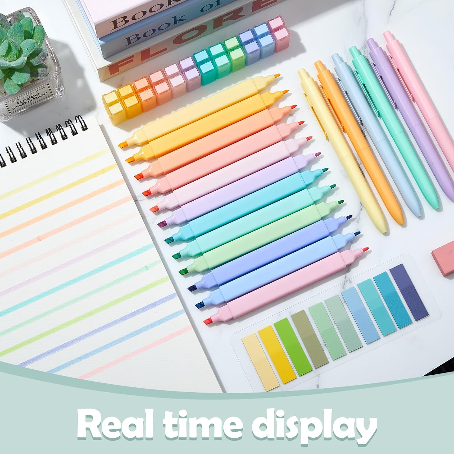 Jutom 38 Pcs Book Annotation Kit Aesthetic Highlighters Gel Pens Set Sticky Notes Tabs Markers Dual Ended Highlighter Quick Dry Ink Pens for Office Annotating Books(Bright Color,Square)