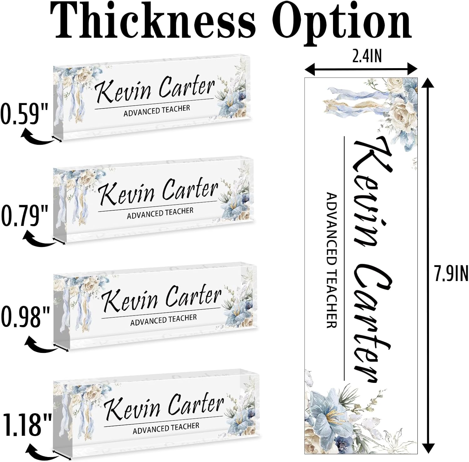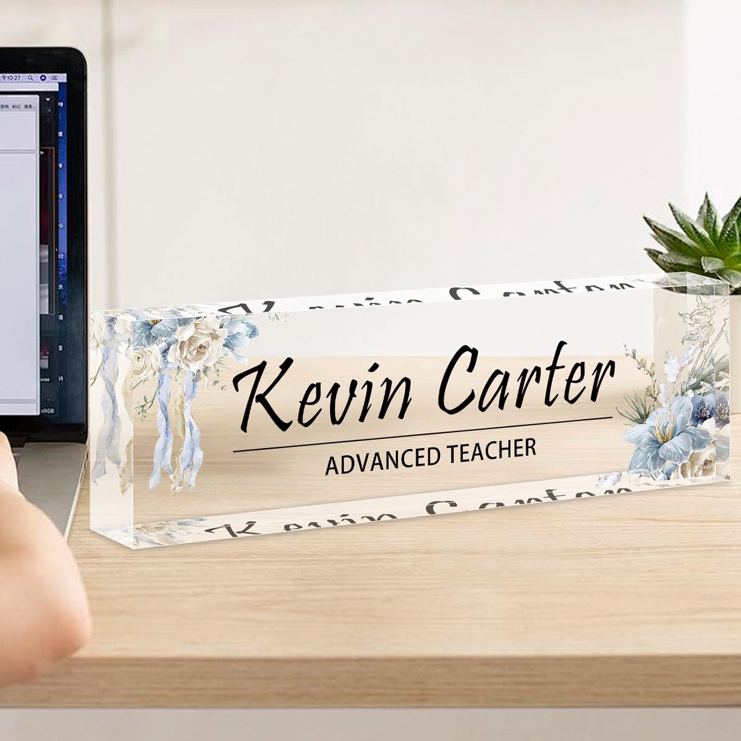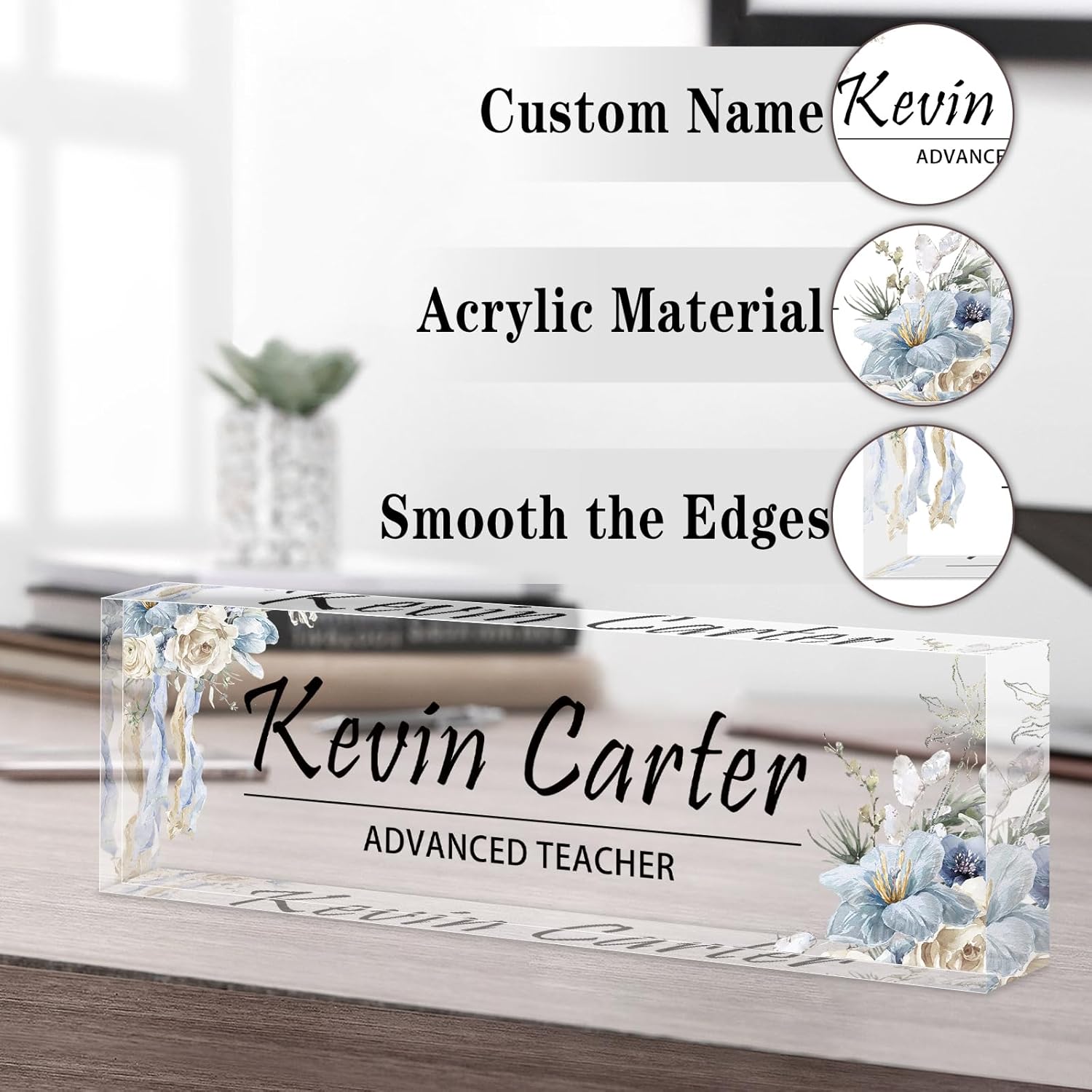 Name Plate for Desk Personalized, Acrylic Desk Decorations, Employee Appreciation Gifts, Custom Office Gifts for Coworkers, Boss, Teacher, Nurse (White Blue Flowers)