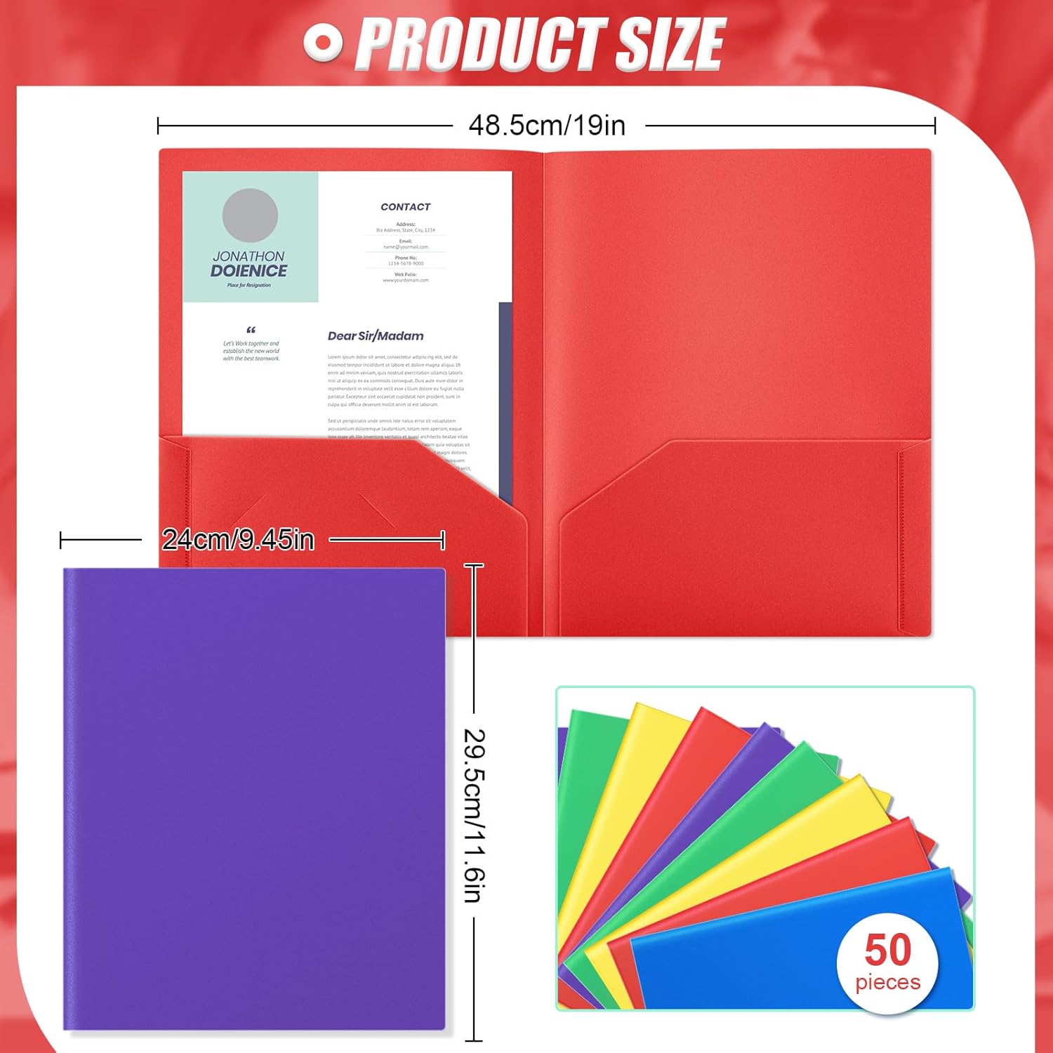 - Enough Quantity to Use and Replace: you will receive 50 pieces multicolored plastic folders, each is designed with 2 pockets, fitting 8.5 x 11 inch letter size paper; Each pocket can stack 50 pages of letter size paper easily and neatly