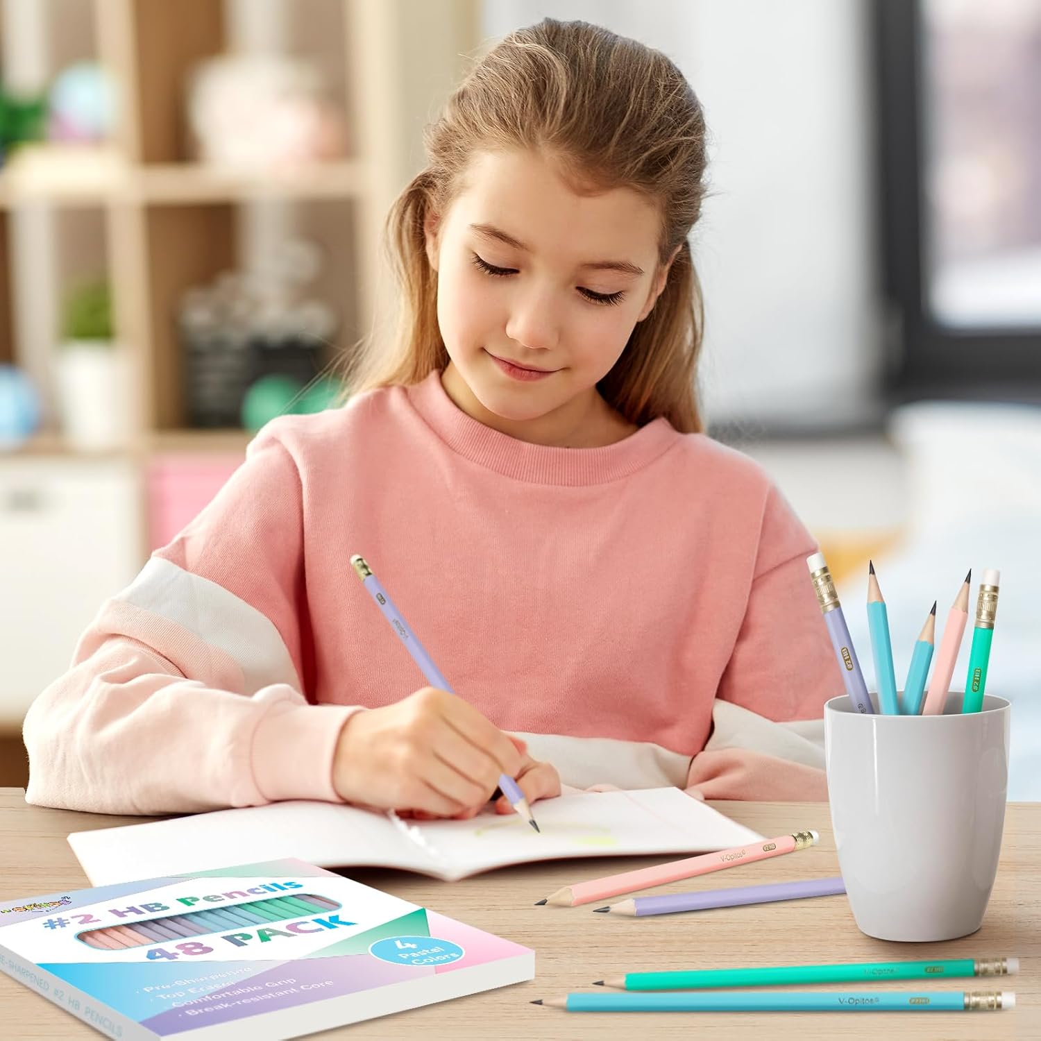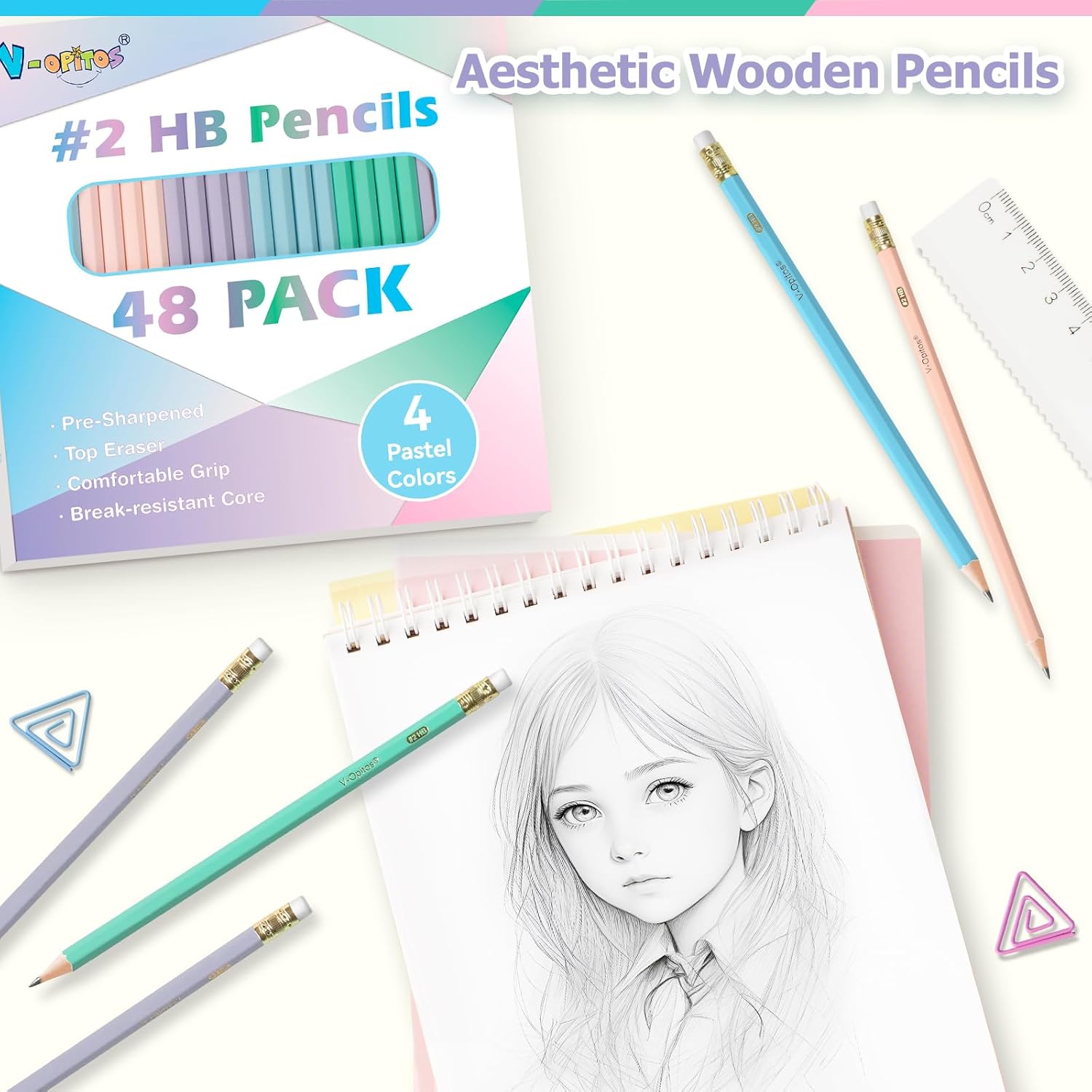 V-Opitos Wood-Cased #2 HB Pencils, 48 Pack Pre-Sharpened Pencils with Top Erasers, Bulk Pastel Color Pencils for School Teacher Supplies, Writing, Drawing and Sketching