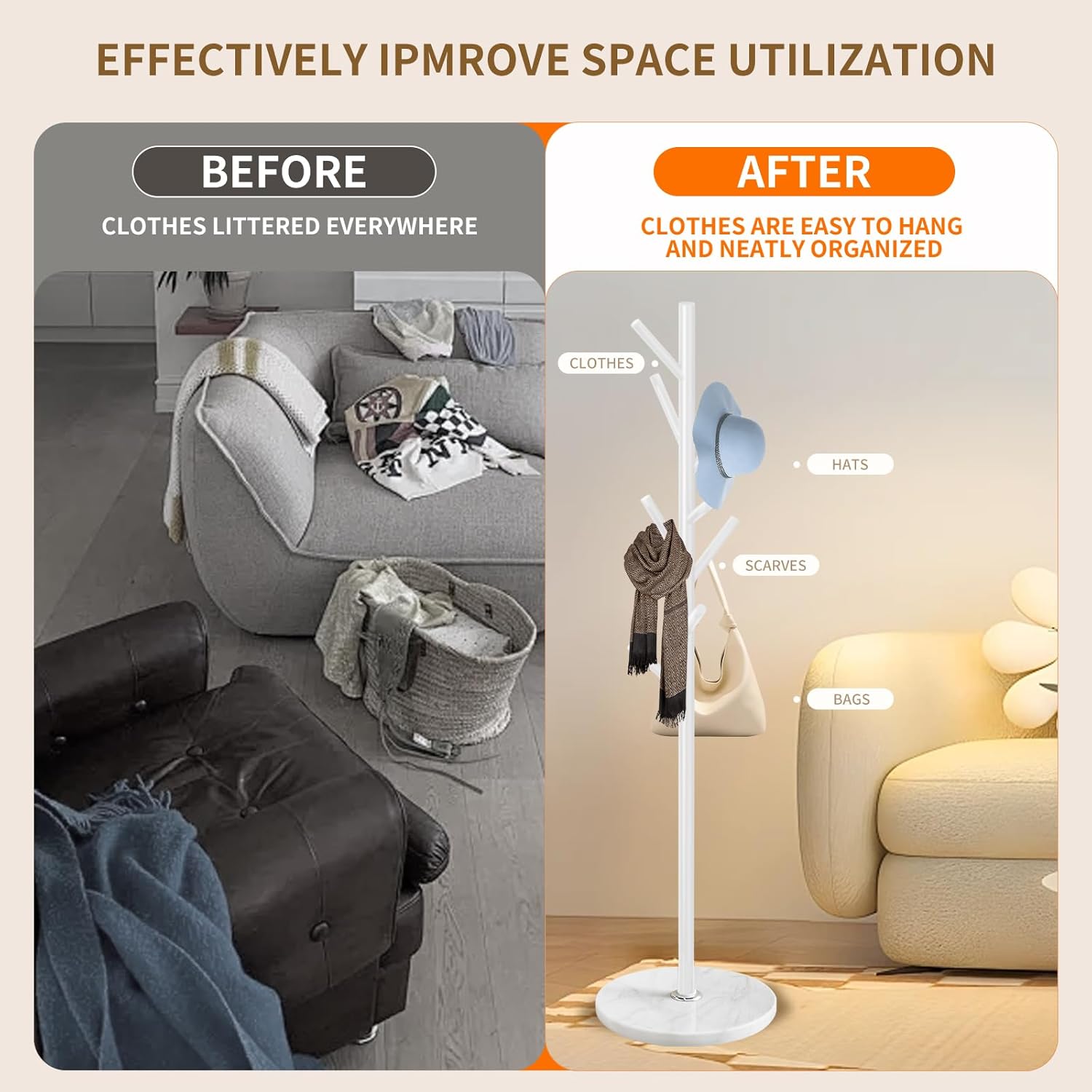 - 100% NATURAL MARBLE BASE:This coat rack freestanding is made of 100% natural marble. Carefully selected natural marble, each piece has a unique vein carved by nature (not a quality issue). The base is 11.81 inch in diameter and 1.18 inch in thickness, very solid and able to support up to 180LBS, hang heavy winter coats and briefcases very firmly without wobbling