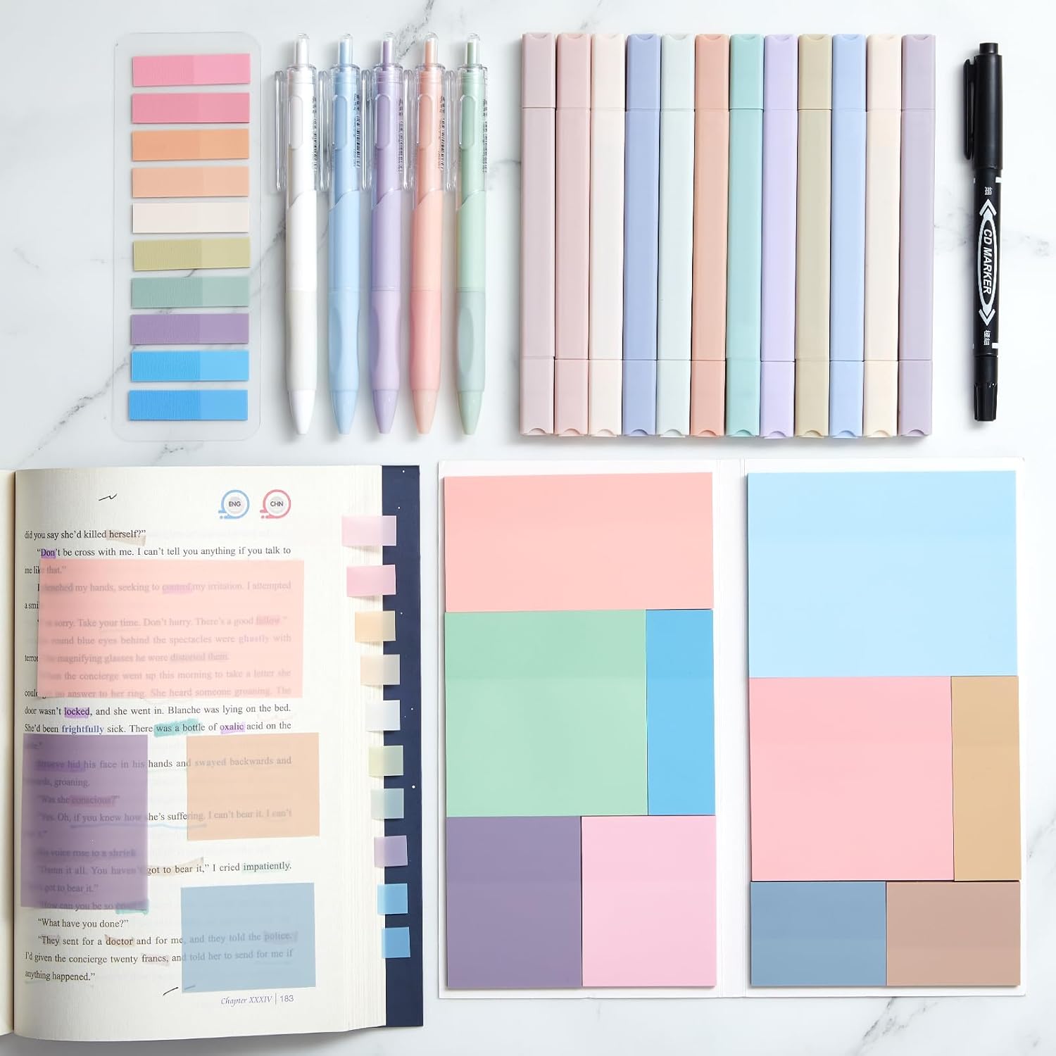 Jutom 38 Pcs Book Annotation Kit Aesthetic Highlighters Gel Pens Set Sticky Notes Tabs Markers Dual Ended Highlighter Quick Dry Ink Pens for Office Annotating Books(Light Color,Square)