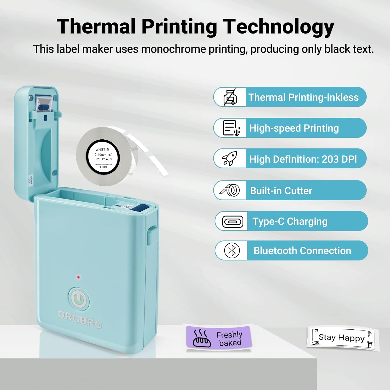 - Label Durability: ORGBRO label maker comes with a roll of 12 x 40 mm white pre-cut labels; ORGBRO labels waterproof, oil-resistant, and abrasion-resistant. No residue remains after removal; Supports continuous label paper (15 mm width) and fixed-length labels (12 x 40 mm); We recommend using ORGBRO thermal label paper for optimal print quality