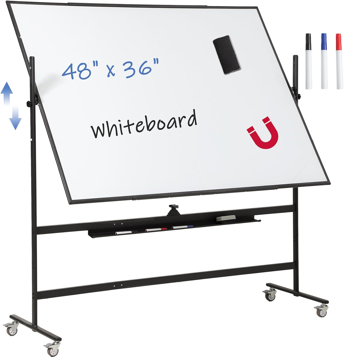 - 【LARGE MOBILE WHITEBOARD】The double-sided whiteboard offers 48" x 36" writing space for displaying your ideas, or making presentations at work. The mobile dry erase board with lockable wheels is ideal for teaching lessons, brainstorming and managing your work presentations, and practical for homeschool, classroom, and office