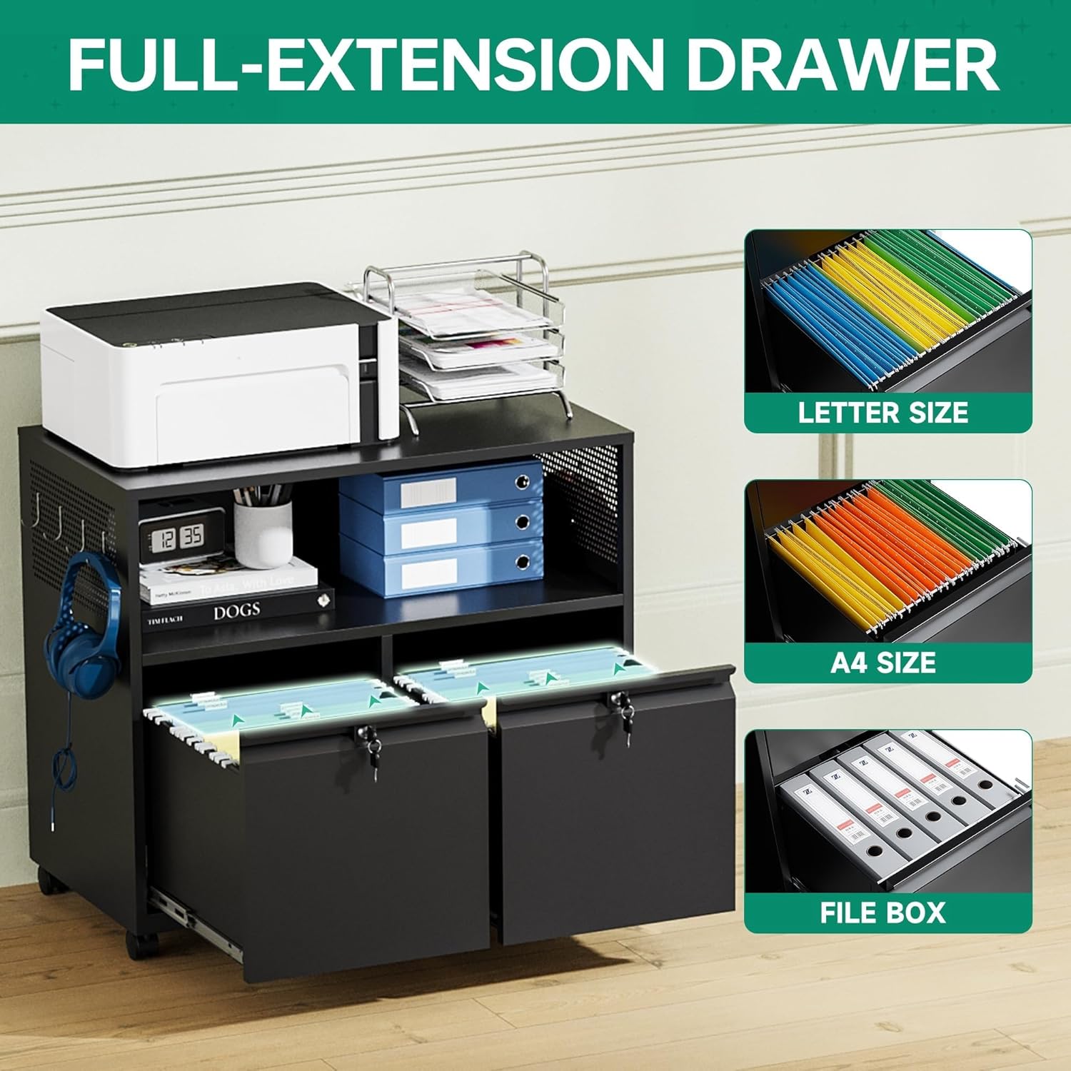 - ăMultifunctional Filing CabinetăLateral filing cabinet with open storage spaces, organization and storage drawers,holds printer stand and office craft storage,side hole panel design is beautiful and can hang items,modern delicate appearance ornamental to your office & home.
