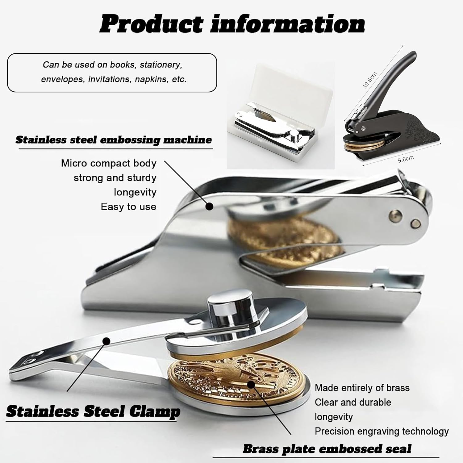 - Quality Materials - Personalized book embossing stamp consists of three parts: copper mold, clip and stand. Precise engraving technology ensures that the stamp molds are clear, concave convex, and durable, making your embossed documents unique.