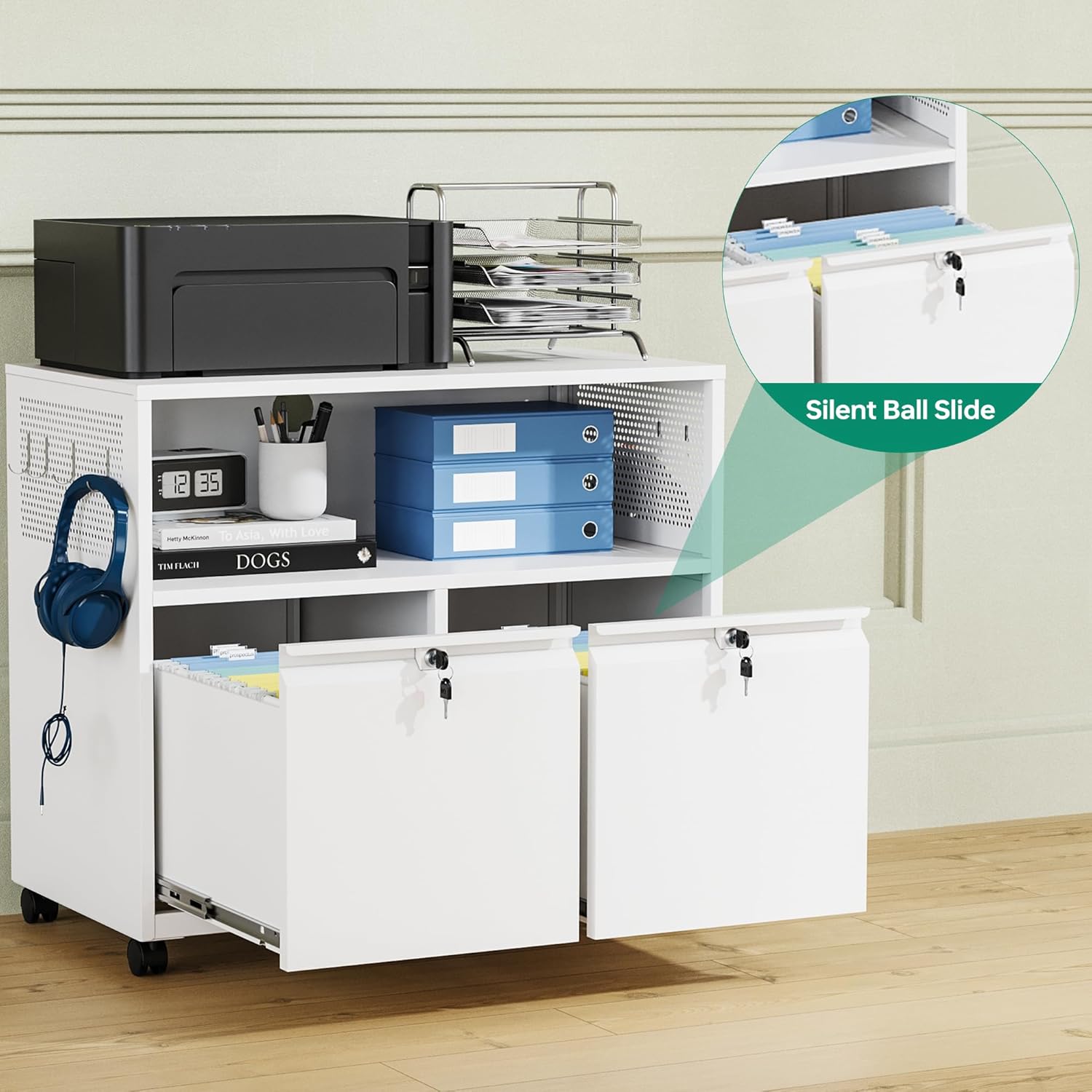 - ăMultifunctional Filing CabinetăLateral filing cabinet with open storage spaces, organization and storage drawers,holds printer stand and office craft storage,side hole panel design is beautiful and can hang items,modern delicate appearance ornamental to your office & home.