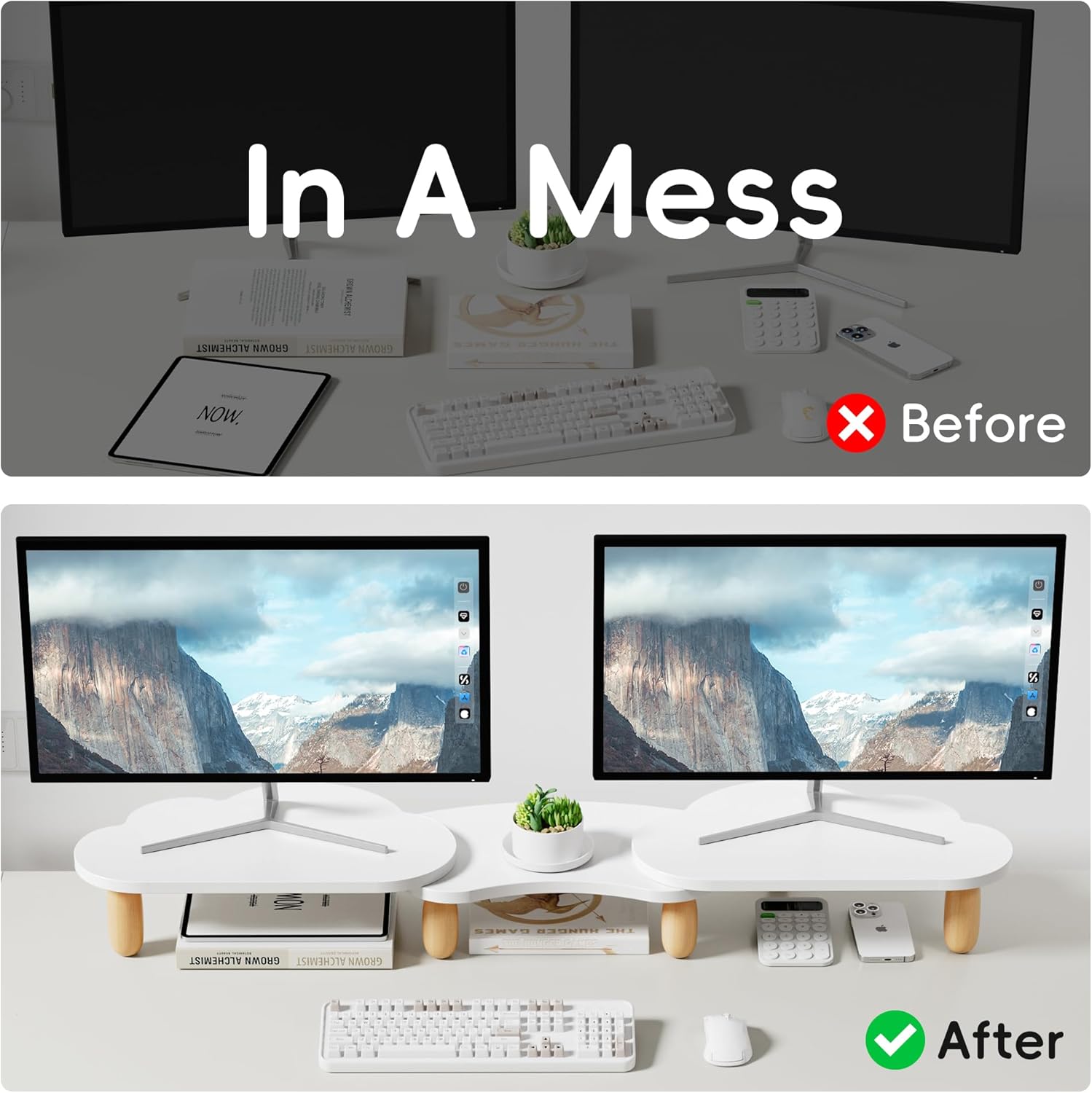 - 【For 2 Monitors】The computer stand can accommodate two monitors. This is an ideal choice when you need multiple computers to work together,also works on both laptops and desktops.The space under the monitor holder could hold tablets, cell phones, cables, pens, clips, and other office supplies.