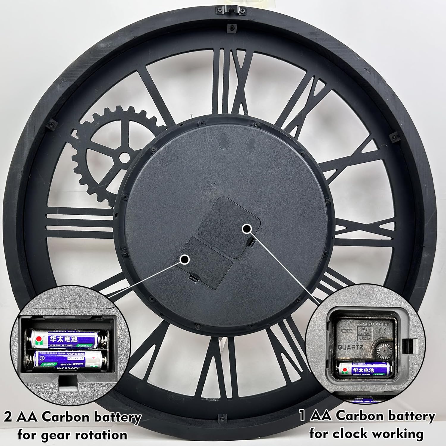 - ACCURATE TIME AND BATTERY OPERATED: Quality quartz sweeping mechanism for accurate time without any ticking sounds. Power by 3 AA Carbon battery operated (not included), large industrial clock takes 2 sets of batteries, one set for the clock and the other for gears that spin. Both of them can be used individually