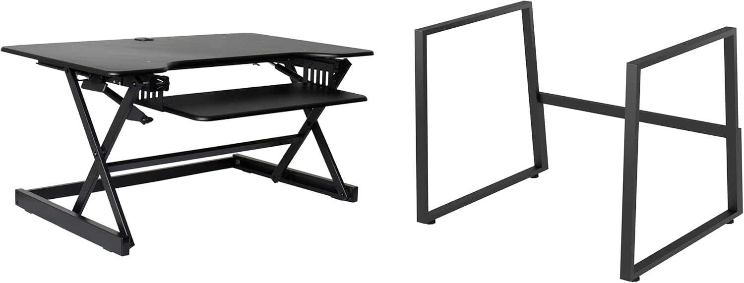 - Large worksurface - 40" by 23.5" desktop workstation can hold up to two 32" monitors, while 25.5" by 11.25" retractable keyboard tray can hold a laptop if needed and keep arms in ergonomic position to prevent strain while sitting or standing.