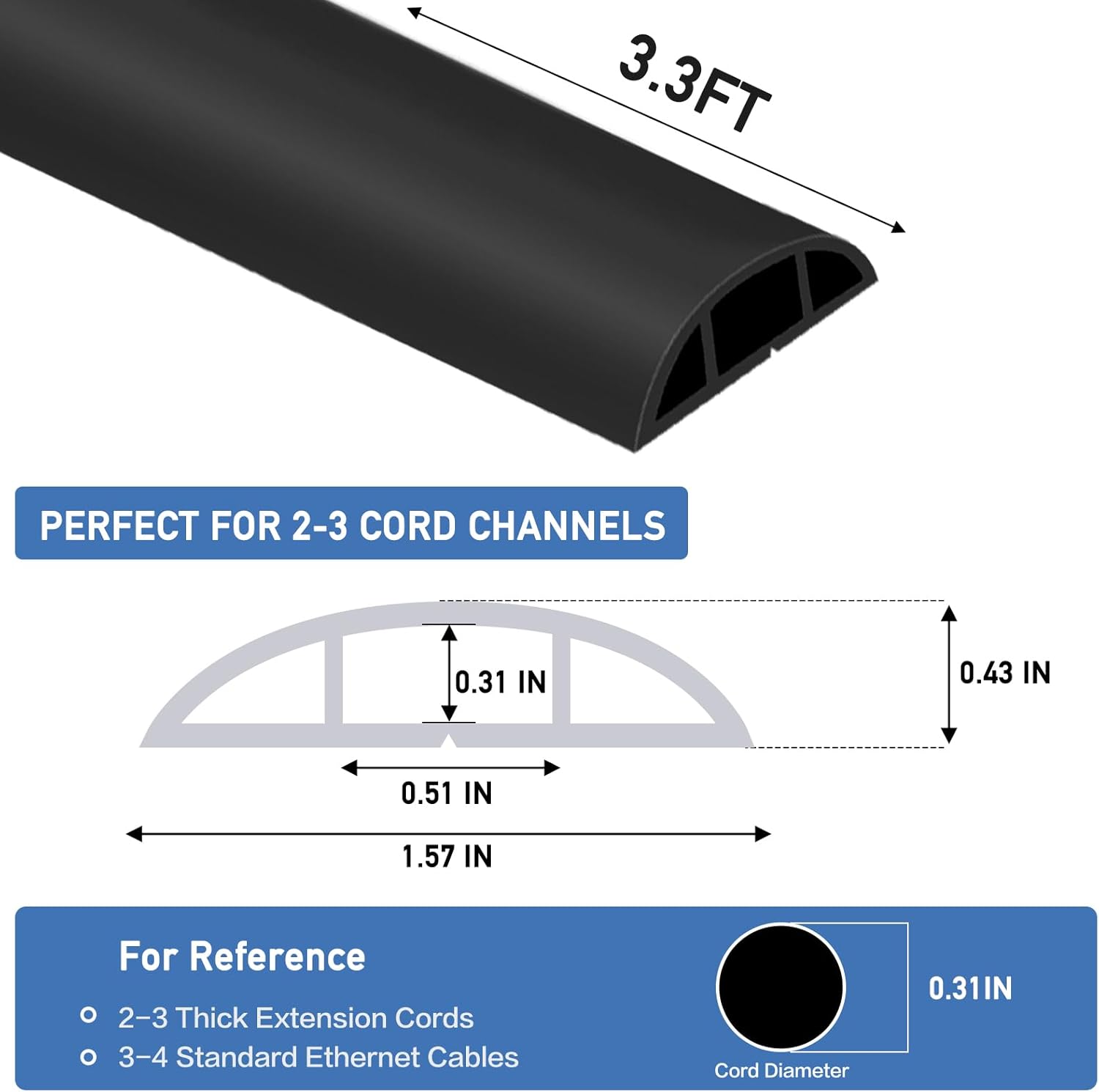 Floor Cord Cover Self Adhesive Cord Hider Floor Extension Cord Covers for Floor Power Cord Protector Cable Management Prevent Cable Trips Cable Cavity 0.51" W x 0.31" H (Black, 3.3Ft)