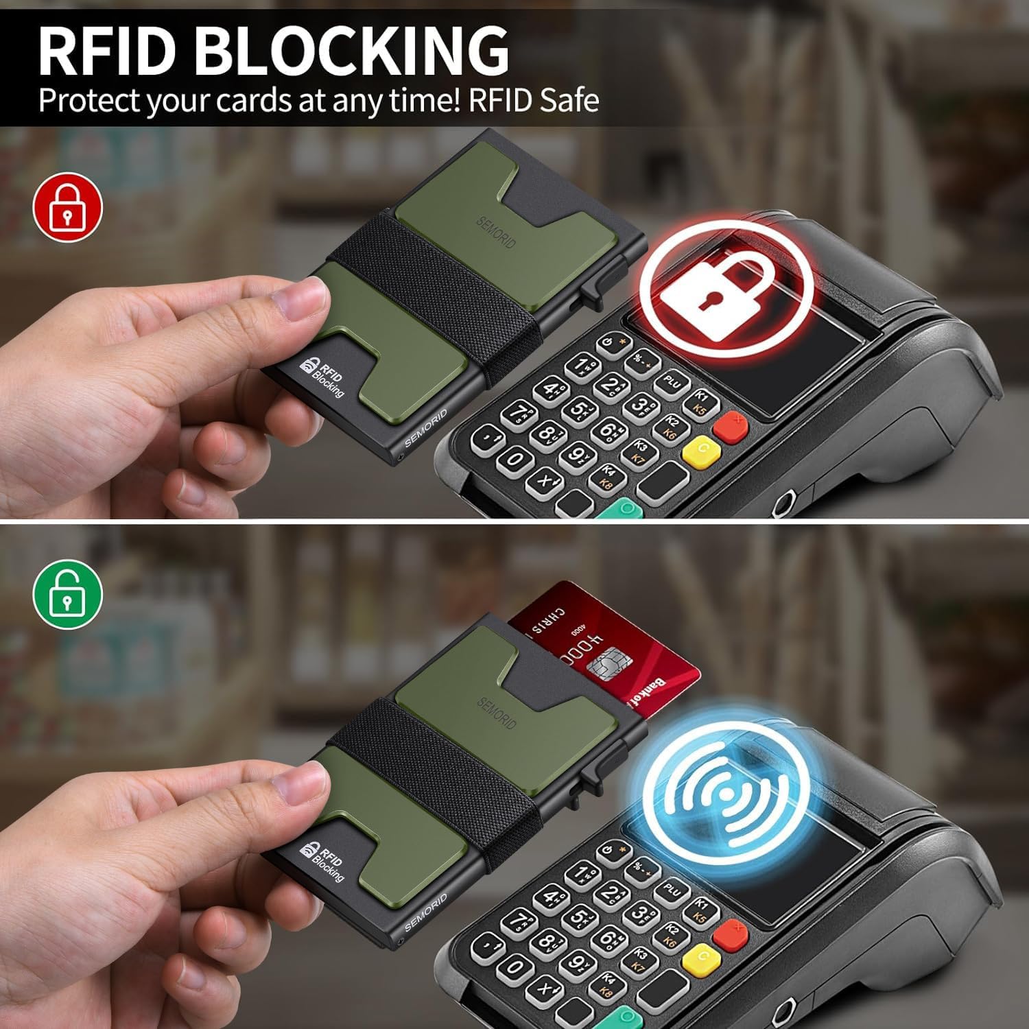 - 💳【Large Storage Capacity】: Our men's wallet can hold up to 12 cards in total - Aluminium card case stores max 5 embossed or 6 smooth cards, in addition the outside expandable backplate holds 6+ cards. The elastic band allows you to hold a few bills or receipts, easily meet your daily card and cash needs.