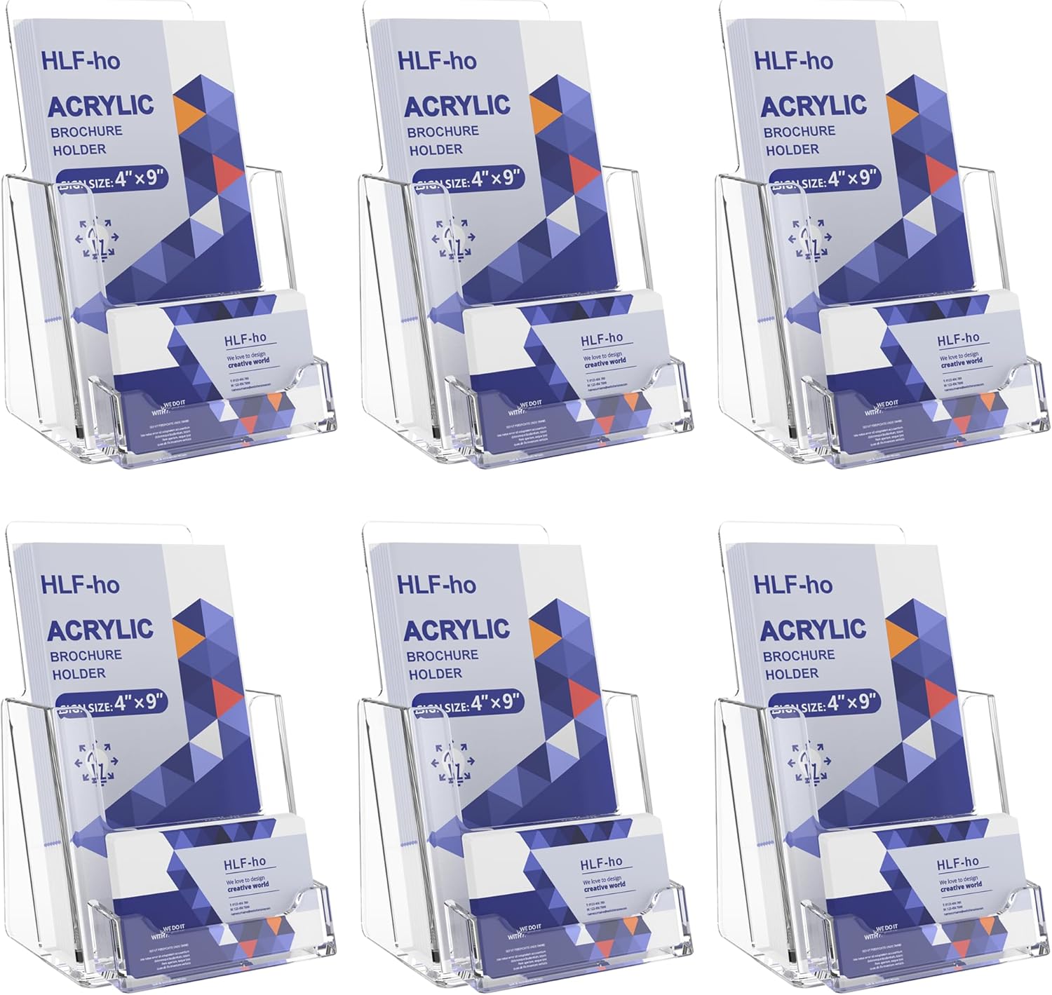 Brochure Holder 4x9 Inch Acrylic Literature Holders Clear Flyer Display Stand with Business Card Slot Pamphlet Holder Multi Purpose Organizer for Office, Lobby, Hotels, Trade Shows, 6 Pack