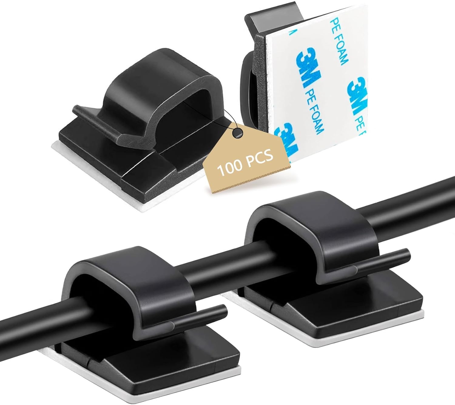 100PCS Adhesive Cable Clips, Wire Holder Organizer Cord Management, Cable Staples Outdoor Strong Cord Clips for Wall, Desk, Christmas Lights, String Lights, TV PC Ethernet Cable, Black Small