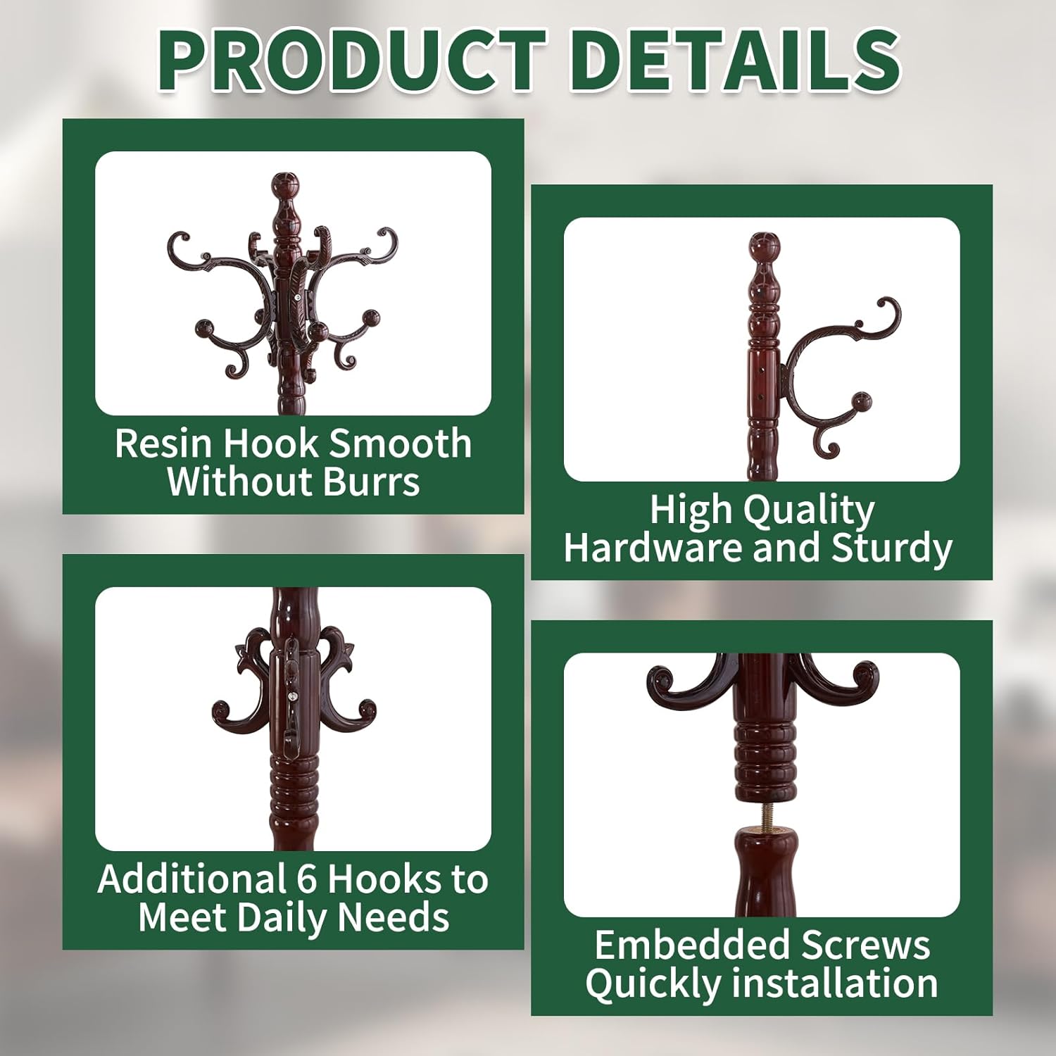 - VINTAGE COAT RACK 14 HOOKS: This coat rack stand has 14 exquisite resin hooks have smooth lines, and each piece is manually polished by workers. The rounded corners are no burrs, and the texture is high-end, takeing care your clothes from damage