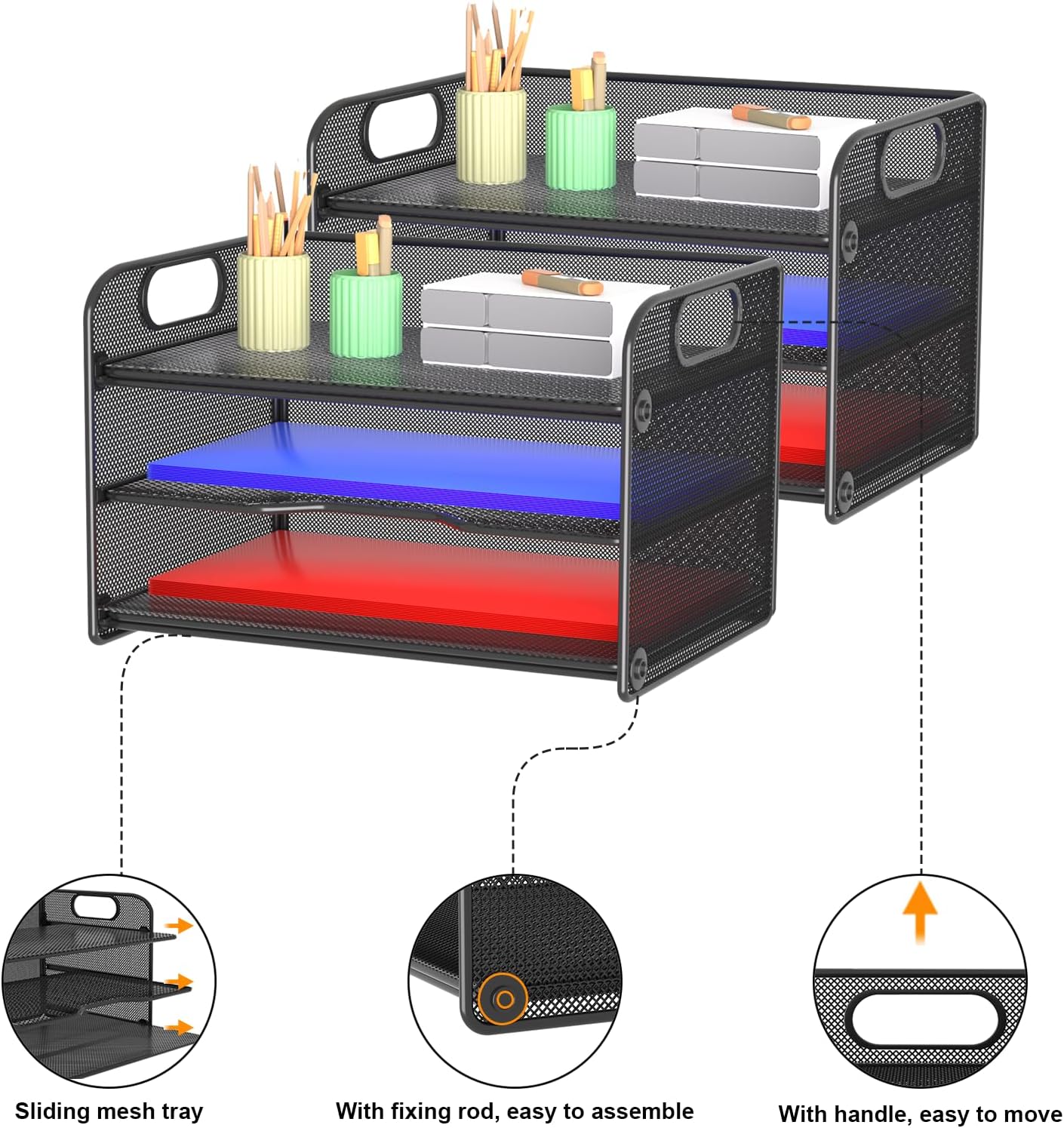 - NEW Updated Handle Design: The desk organizer comes with handles, makes it easier to move.Also the paper tray comes with 2 metal bars to reinforce, which makes it more sturdy and much easier to assemble.