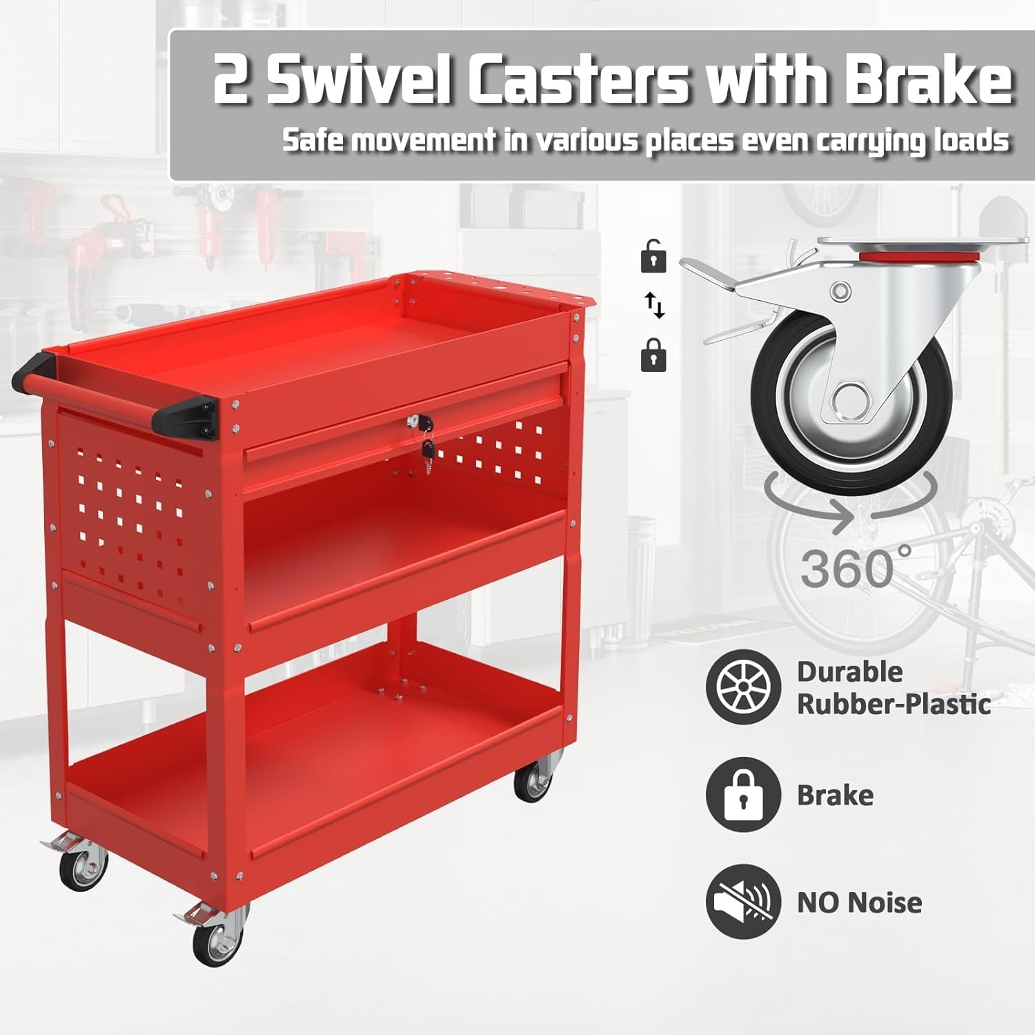 - 【Easy to Move】Pelnuies shop cart with wheels is equipped with 2 universal brake wheels, you can transport heavy objects without extra help, safe and flexible; you can adjust the forward direction of tool cart by rotating 360°, easy to cope with different use scenarios; rubber wrapped brake wheels allow you to operate utility cart without damaging the floor,adapt to various environments of the road.