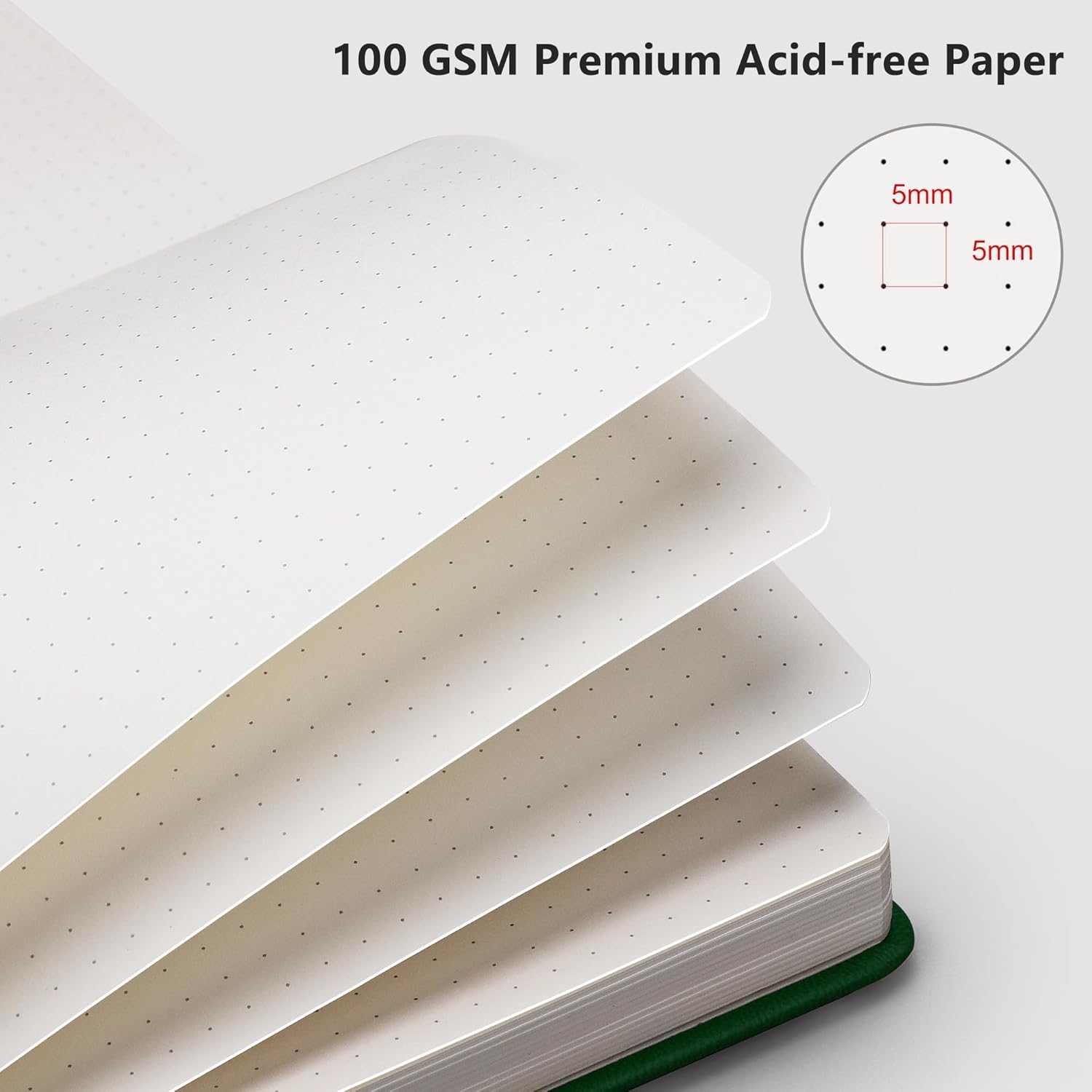 - PREMIUM PAPER: Crafted with time-resistant 100 GSM paper, this dotted journal preserves thoughts flawlessly while resisting ghosting/bleed-through with most pens. Acid-free material ensures long-term preservation, and its smooth surface enhances writing clarity - blending durability and premium performance