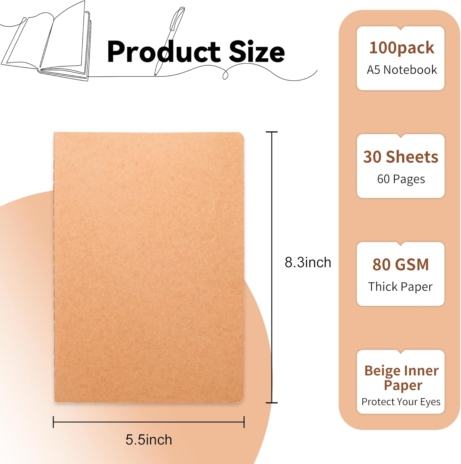 100 Pack Blank Kraft Notebooks, 8.3x5.5 Inches A5 Small Journals Bulk Blank Notebooks 80 Gsm Unlined with 60 Pages A5 Subject Notebooks Traveler Journal Set for Adult Students Back to School Supplies
