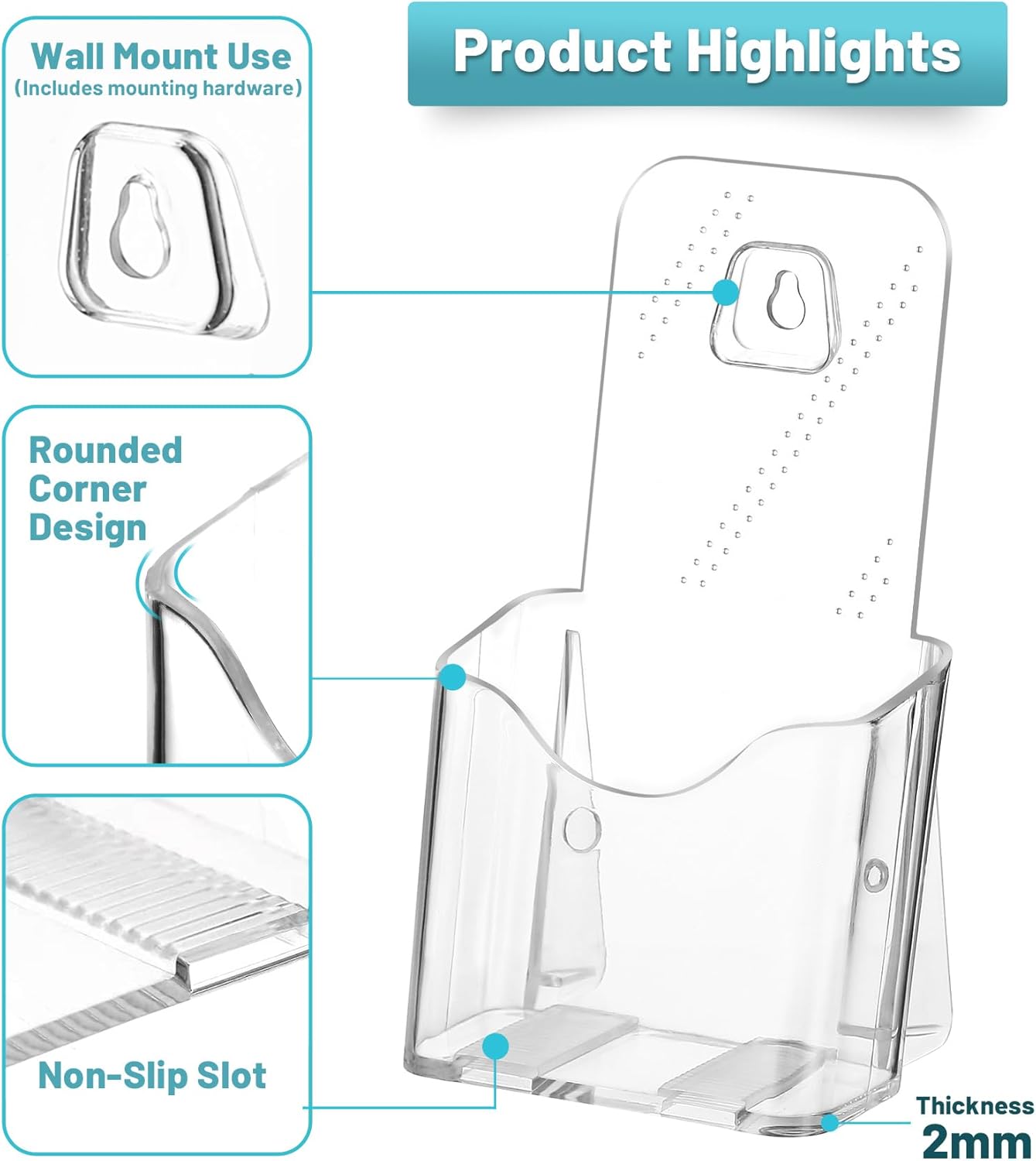 - 【Sturdy Premium Acrylic】The brochure display stand is made of high-quality acrylic, they are transparent and solid, providing long-lasting use; The pamphlet holder's slanted back design ensures a perfect display effect, increasing the likelihood of the brochures being noticed and picked up, thereby enhancing brand awareness.