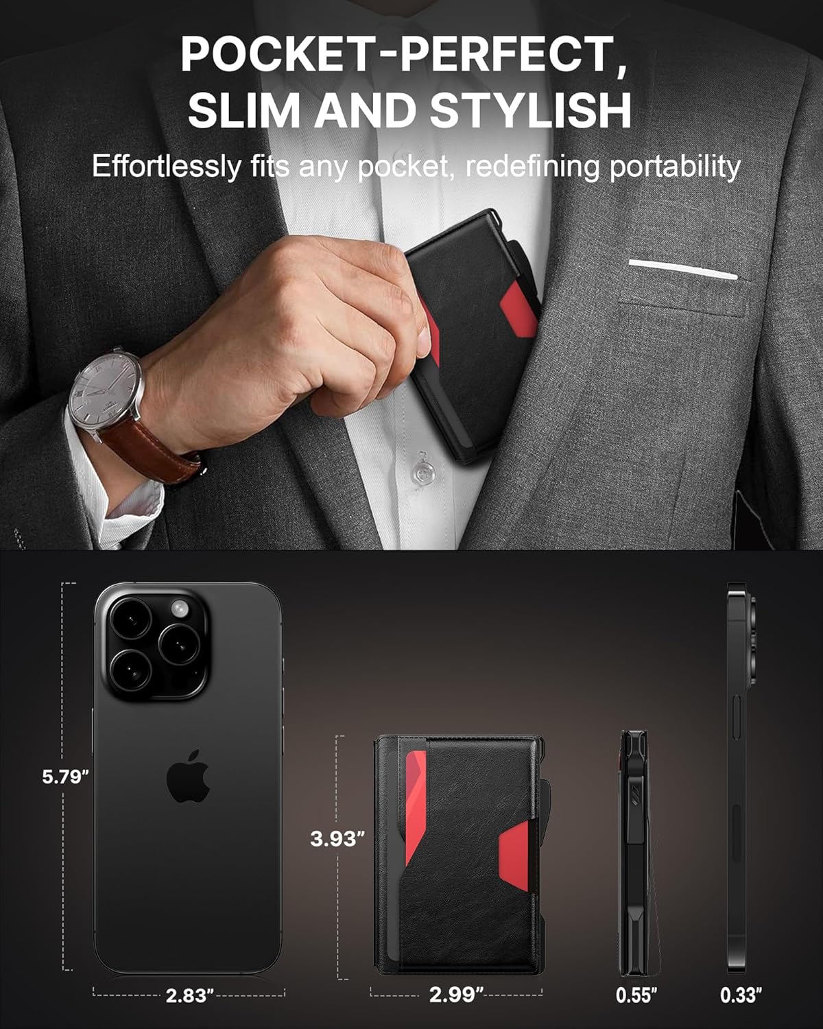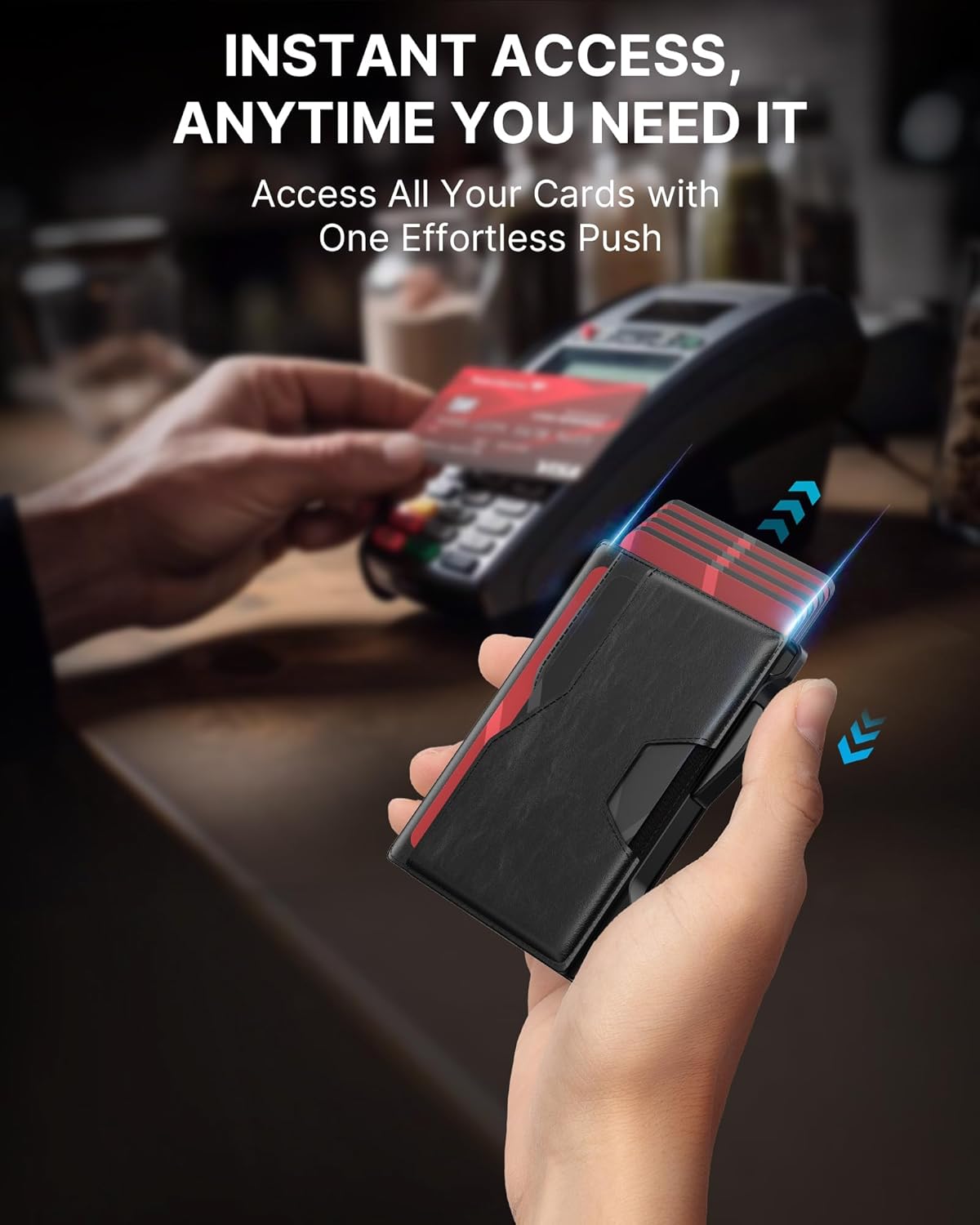 - Quick Card Access: Designed for speed, this wallet's smart pop up mechanism allows you to instantly view and select your cards. The front and back pocket provide 3 quick-release option for your frequently used card, ensuring they're always within reach.