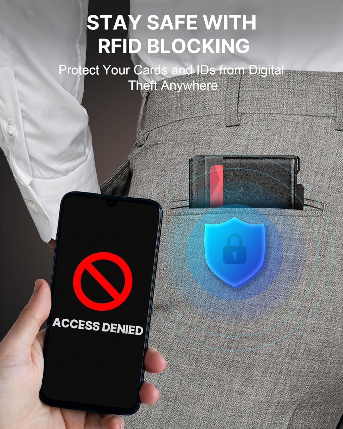 - RFID Protection: Protect your cards and personal information with advanced RFID blocking technology, effectively blocking the 13.56 MHz frequency. This ensures that your cards are protected from unauthorized scanning.