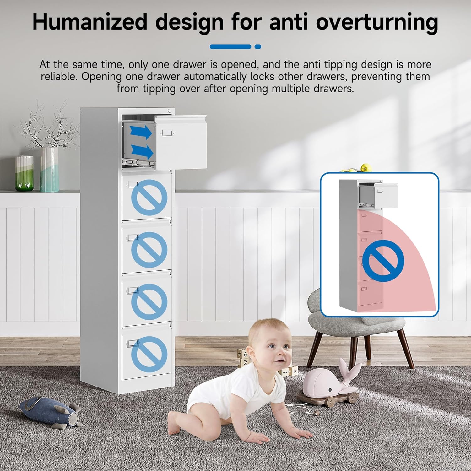 - ăHIGH SECURITYăThis file cabinet can lock 5 drawers at the same time with one lock, and is equipped with 2 keys. With an anti-tilting mechanism, when 1drawer is opened, the interlocking system prevents the other drawer from opening, thereby preventing tipping and protecting your safety.