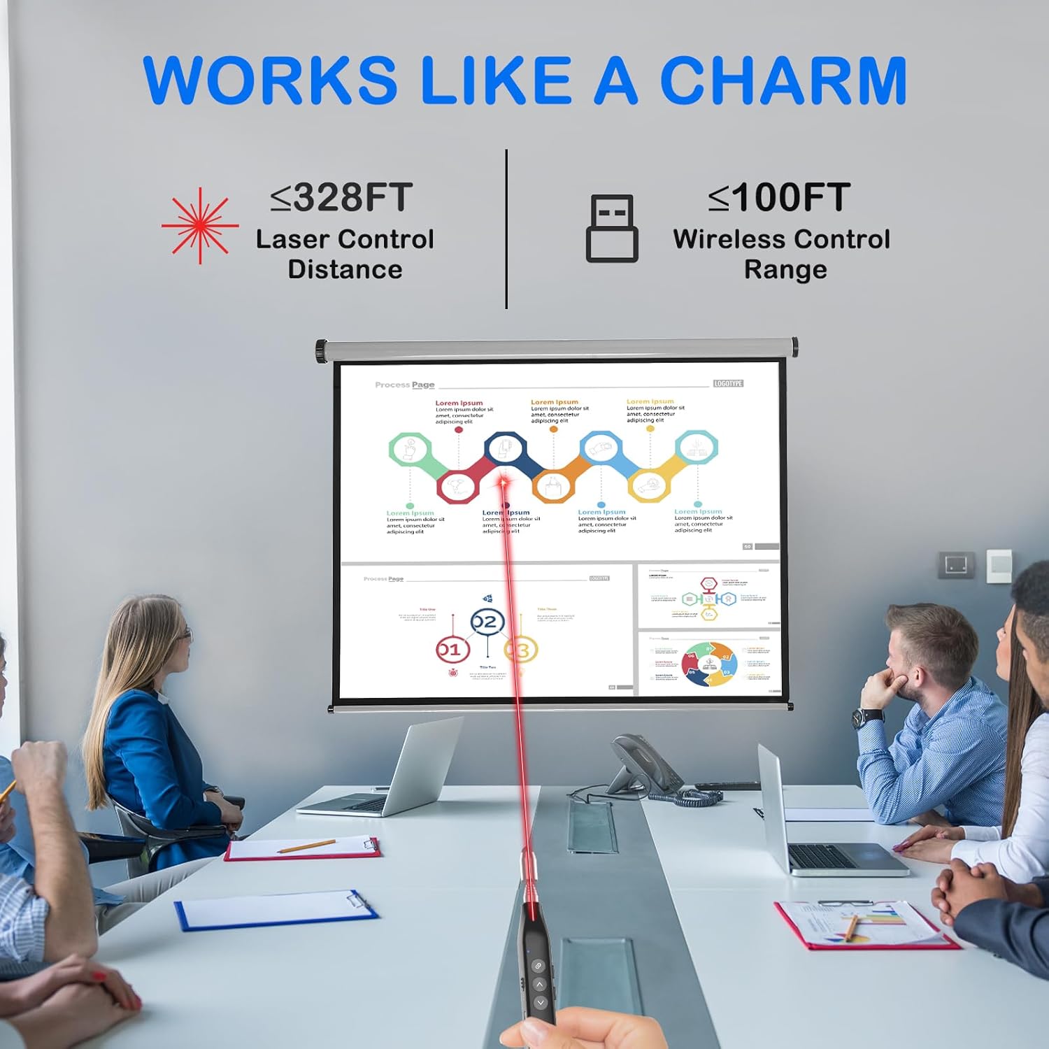 - [Wireless Presentation Clicker & Laser Pointer]This is a clicker for powerpoint presentations with a very bright red laser pointer. You can change your PPT/ Google slide from anywhere in the room, while pointing the specific parts of the slide by laser. PowerPoint clicker controls range:98FT/30M, laser pointer range: 328FT/100M.