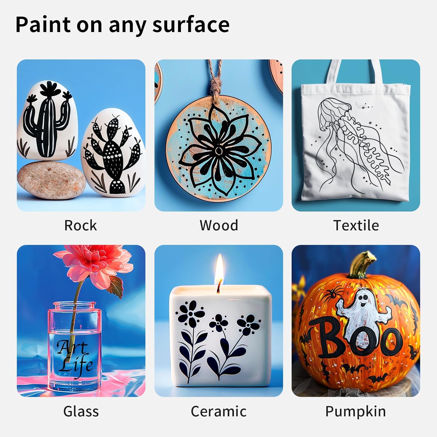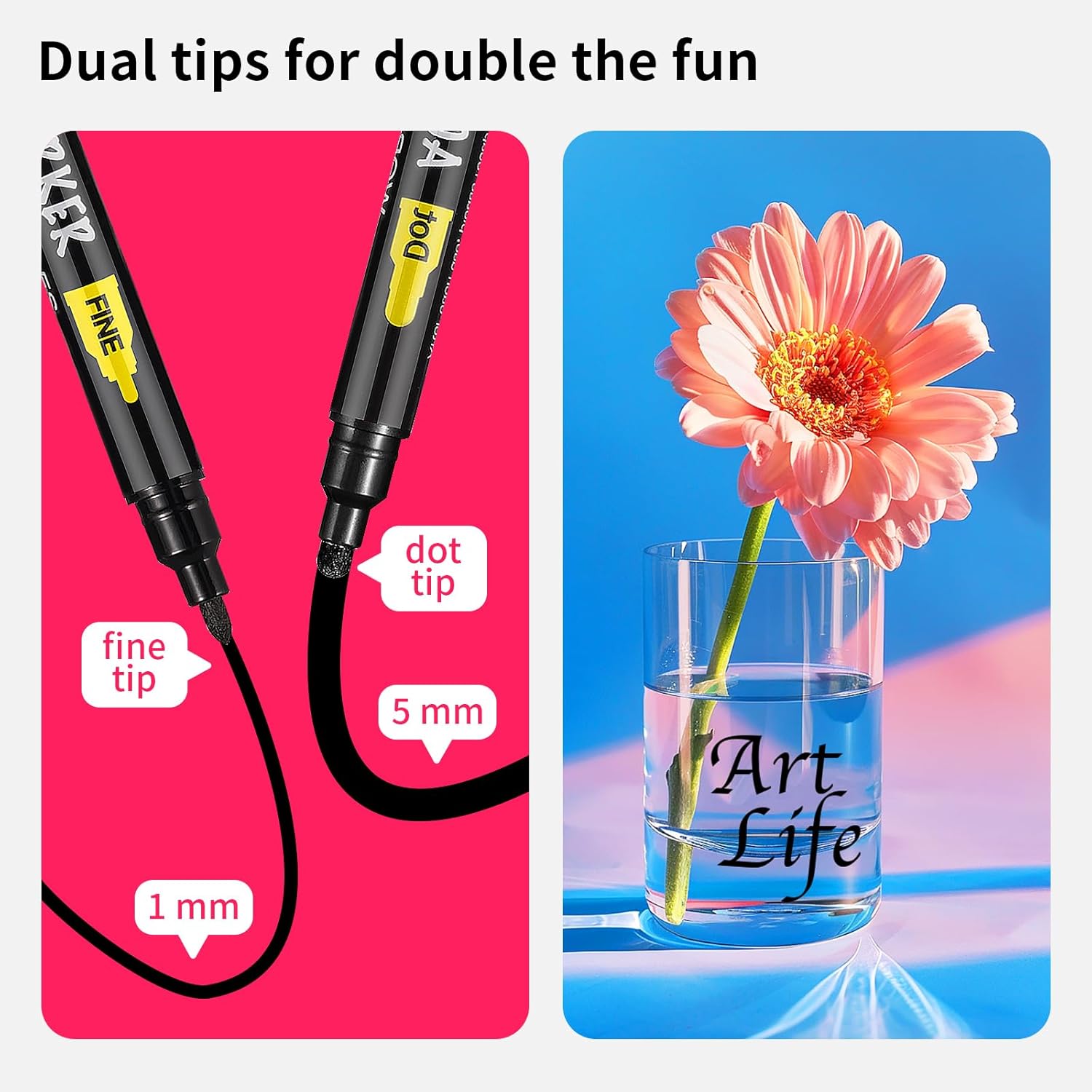 - DUAL TIP: Our rock painting pens come with a 1-5 mm dot tip and a 1mm fine tip. Designed to give you the flexibility to switch effortlessly between fine lines and bold strokes, these paint pens acrylic markers expand your creative horizons and enhance the intricate details in your work.