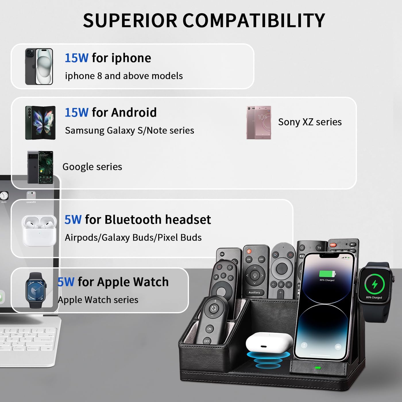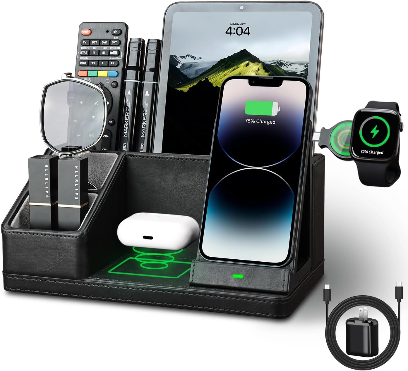 - ▶【Multi-Functional Organizer with Charging Station】: This all-in-one desk organizer with wireless charging station, with dedicated spots made for your iPhone/Apple Watch/AirPods charging at the same time; and keeping your pens, remote control, glasses, and other daily-used small things. Say goodbye to tangled cords and enjoy wireless charging by simply laying your device on the charging stand, no more plug-in/ out troubles.