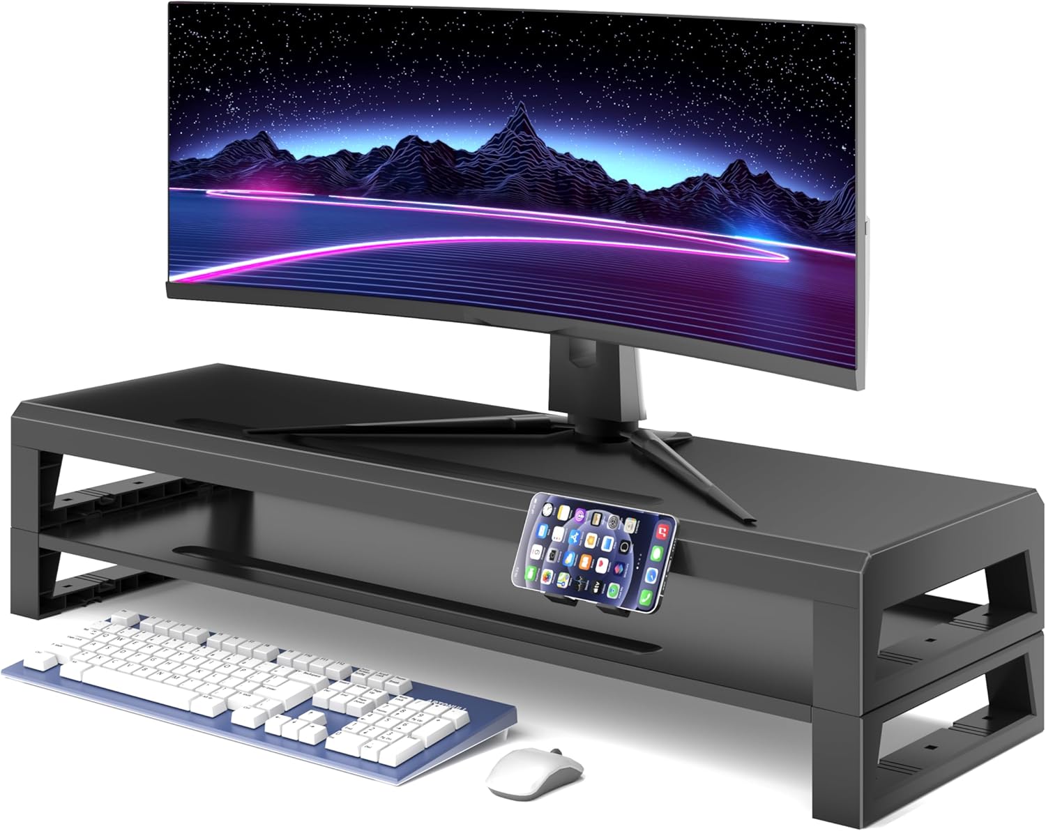 - 【2-Tier Storage Space Organizer】The monitor stand tube adopts a 2-tier storage design, providing ample desktop storage space. It also includes a detachable phone stand, making it convenient to store keyboards, mice, smartphones, tablets, hard disk drives, laptops, iMac, and other devices, keeping your office desk tidy and organized.