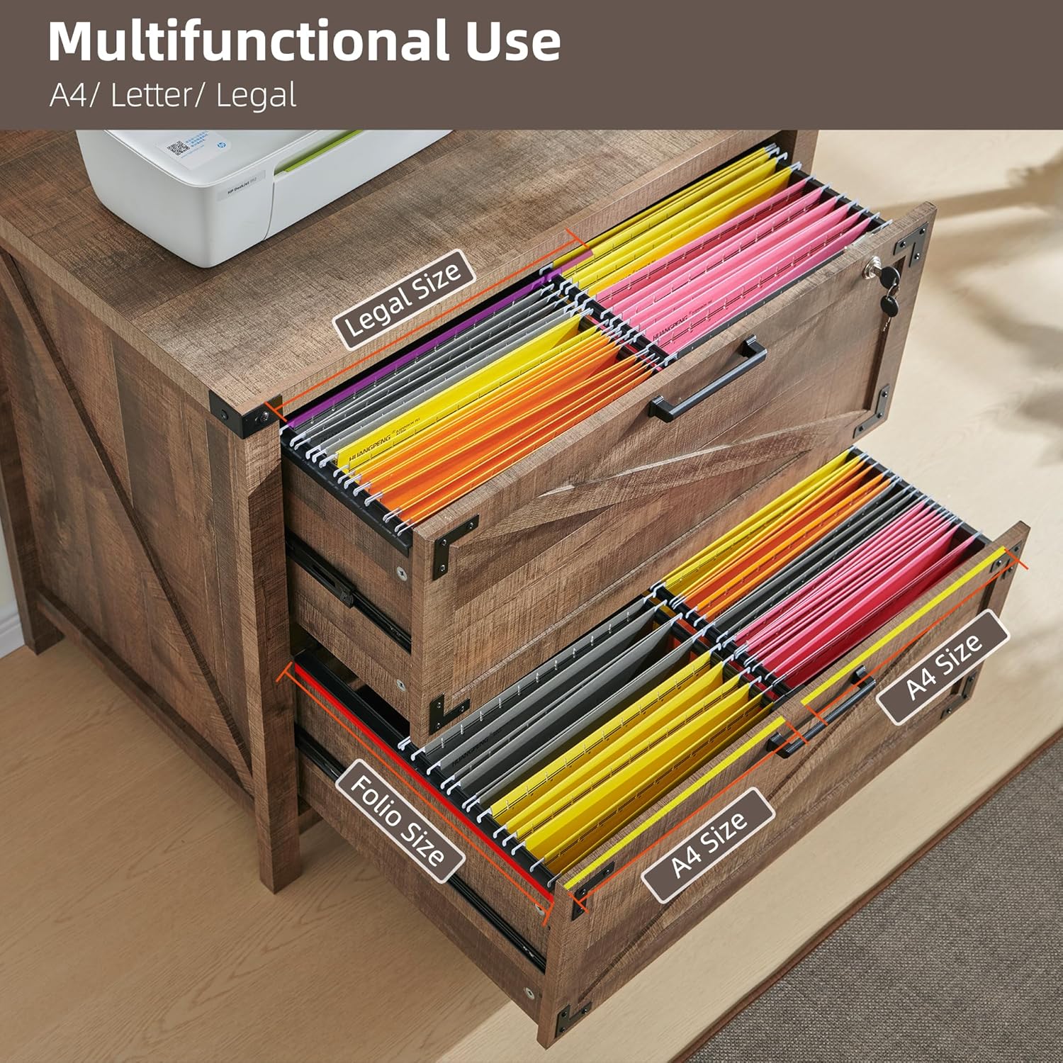 - Versatile File Compatibility & Lockable: Designed to accommodate various file sizes, including legal, letter, A4, and F4, this filing cabinet offers flexibility to store and manage various file formats. No more hassle of finding the right cabinet for different file types.The lockable top drawer provides added privacy and security for your personal items.