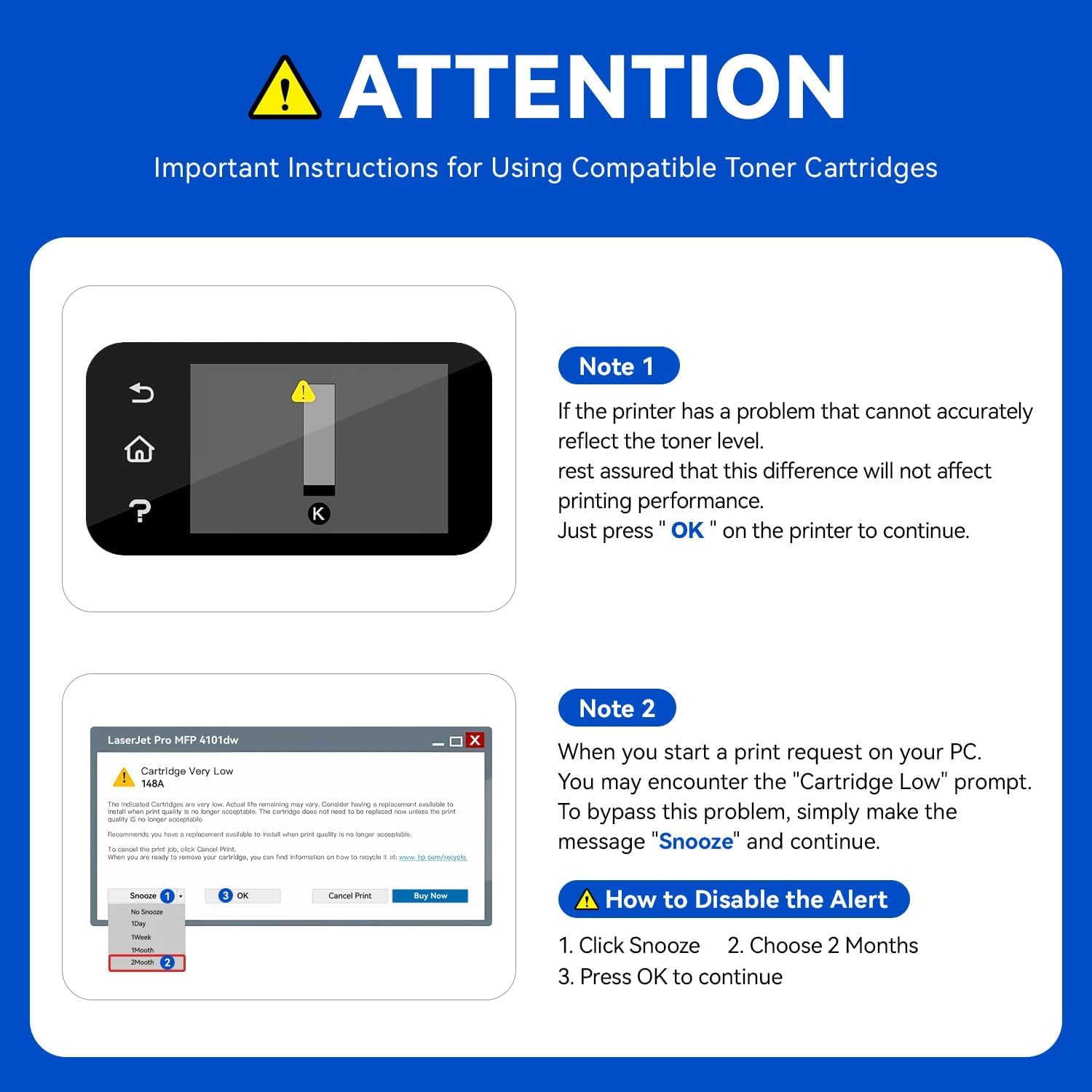 - š¢Important Note: Please must close the HP Genuine Mode before you install compatible toner cartridge with chip, the step is Setup >Supply Settings >Cartridge Supply>off. In order to avoid firmware update to block the compatible toner cartridge to be used continuously in the future, please also close the Printer Update and Firmware Update in Setup.