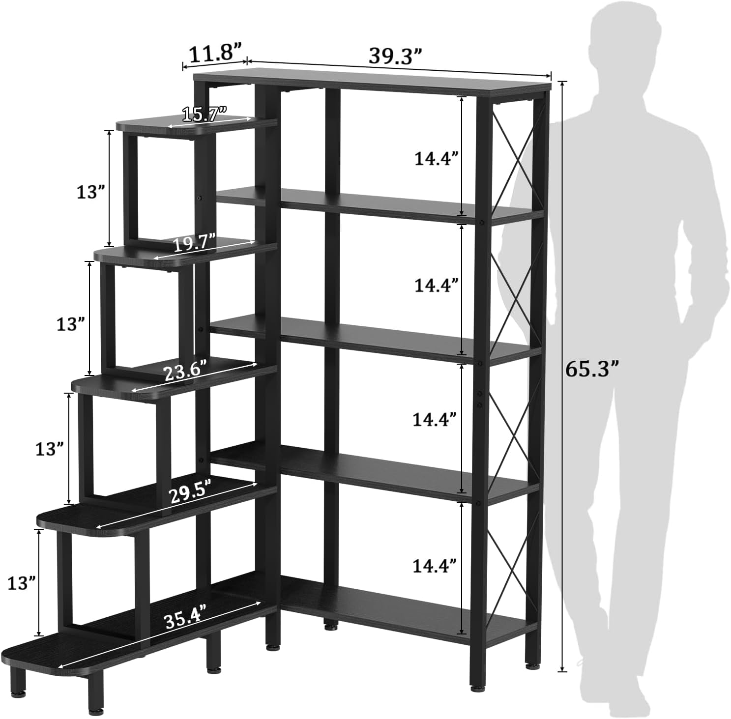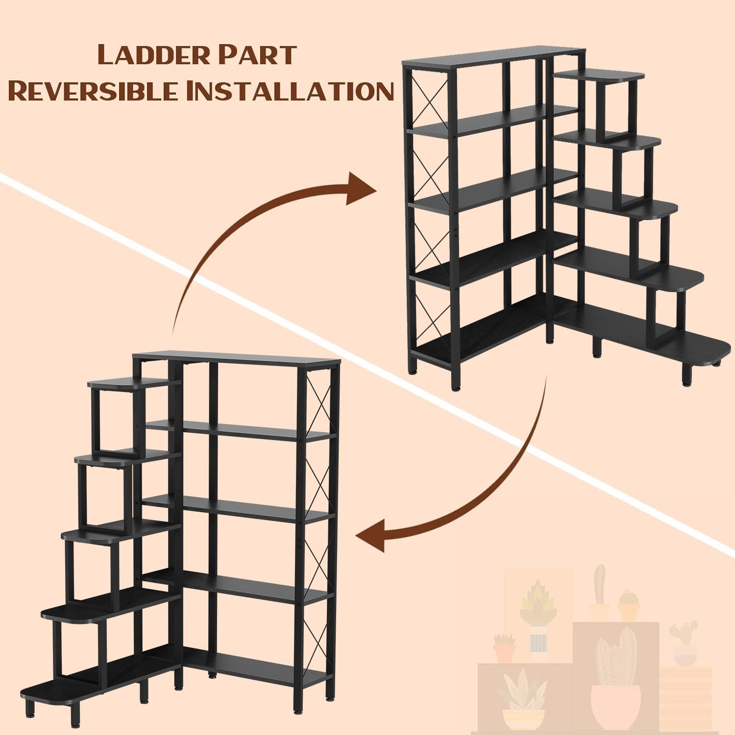 Corner Bookshelf Bookcase, Large Reversible 5 Tier Ladder Shelves Storage Display Rack with Metal Frame, Industrial Home Office Furniture for Living Room Bedroom, Black