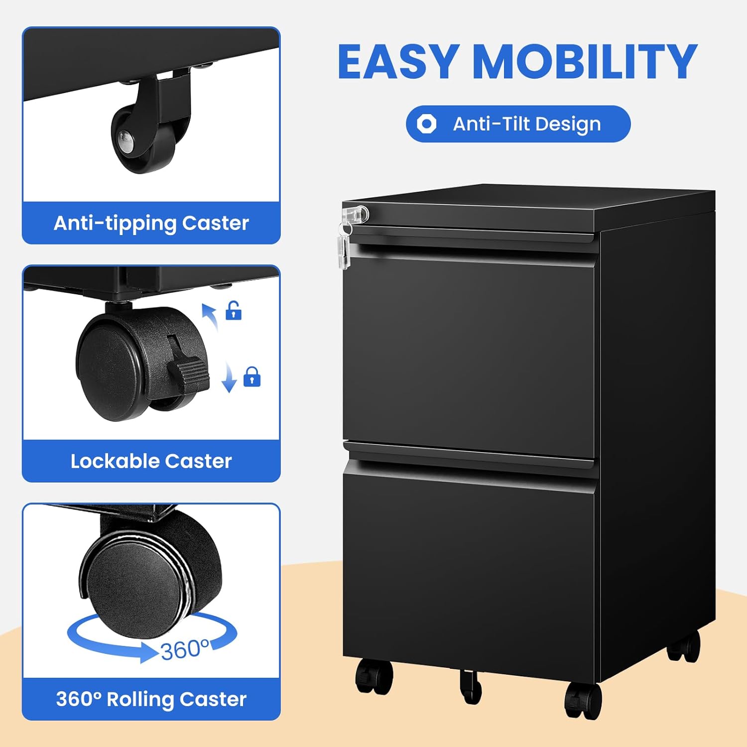 - ăMobile File Cabinet ă: Equipped with 2 lockable casters + 2 x 360° swivel casters + 1x anti-tilt wheel, you can move this filing cabinet easily. 360° swivel casters go to any direction easily, while lockable casters offer braking and the center support wheel prevents tipping.