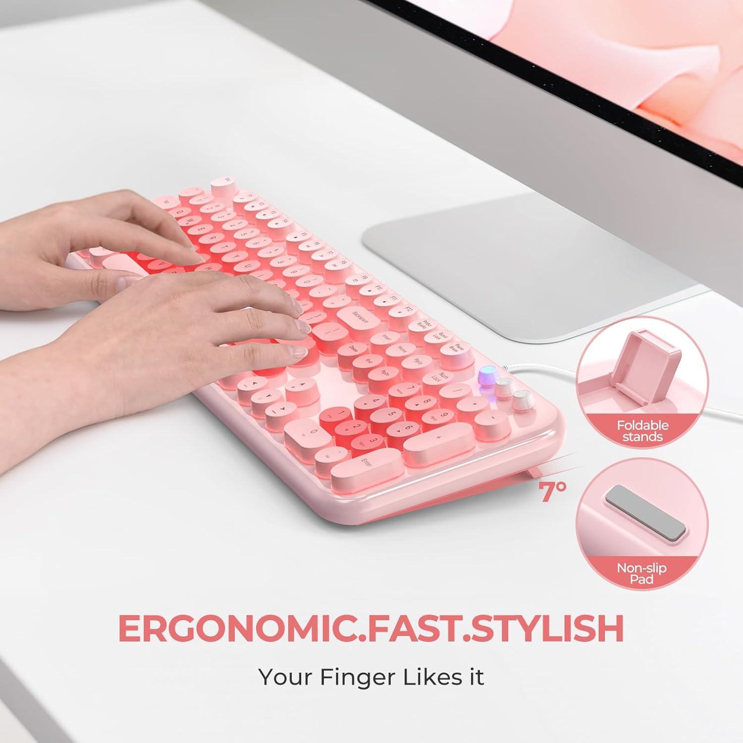 - 【Retro Backlit Keyboard】 The USB keyboard is designed with cute round keycaps and LED backlight, the illuminated keys make it easier to type at night, brighten up your device and your desk.