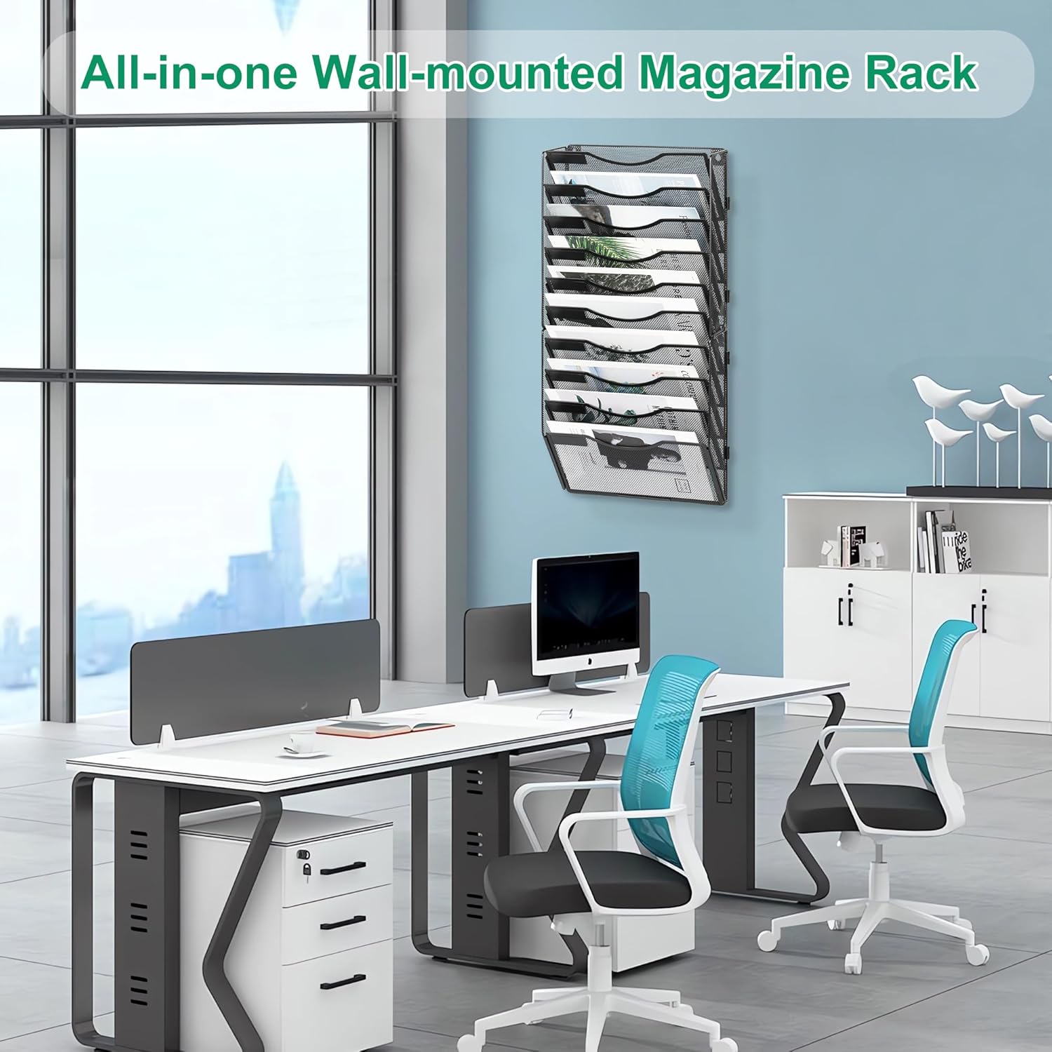 10-Pocket Wall File Organizer, Hanging Mail Organizer Wall Mounted Paper Document Holder, Metal Clipboard Storage Basket for Office Home School Organization, Black