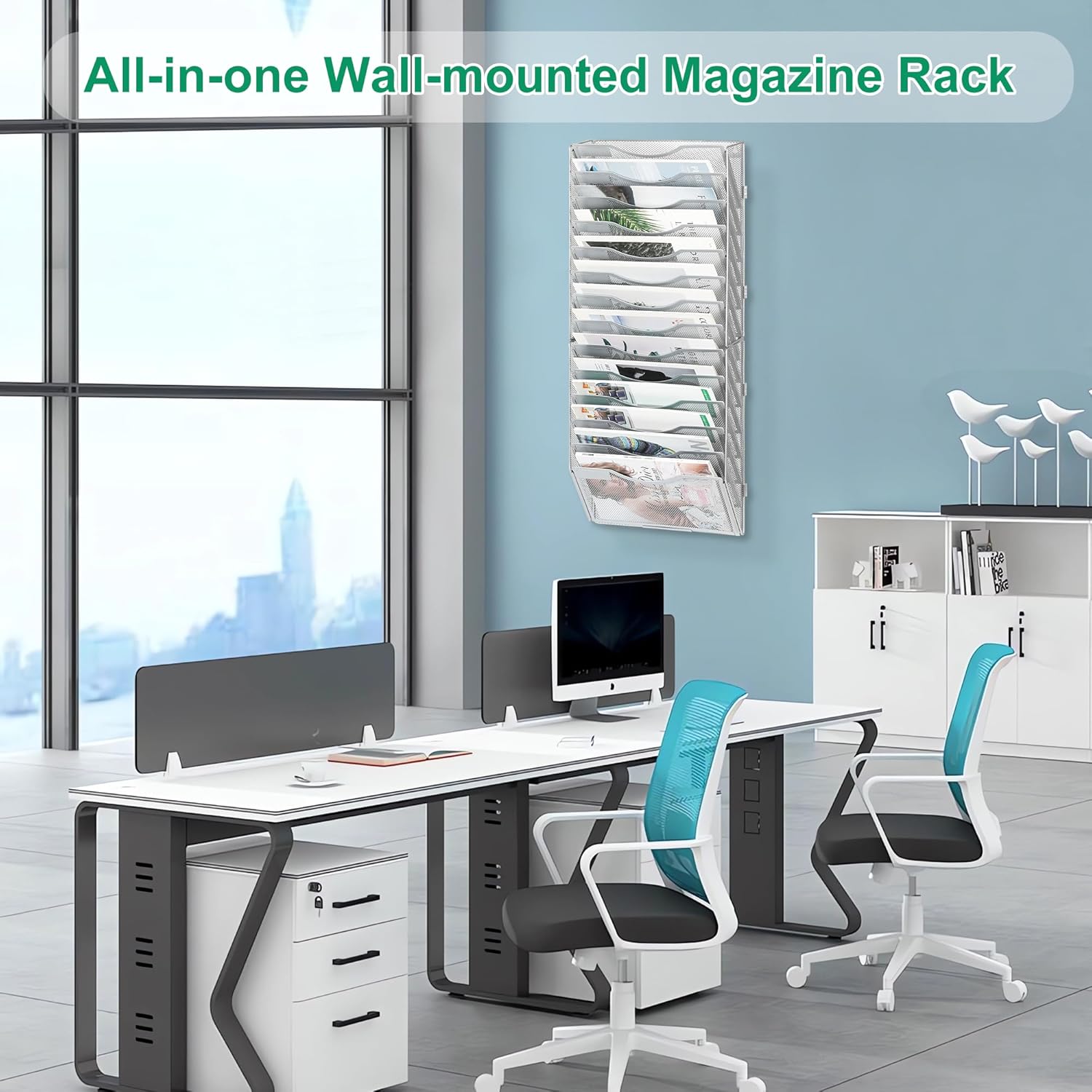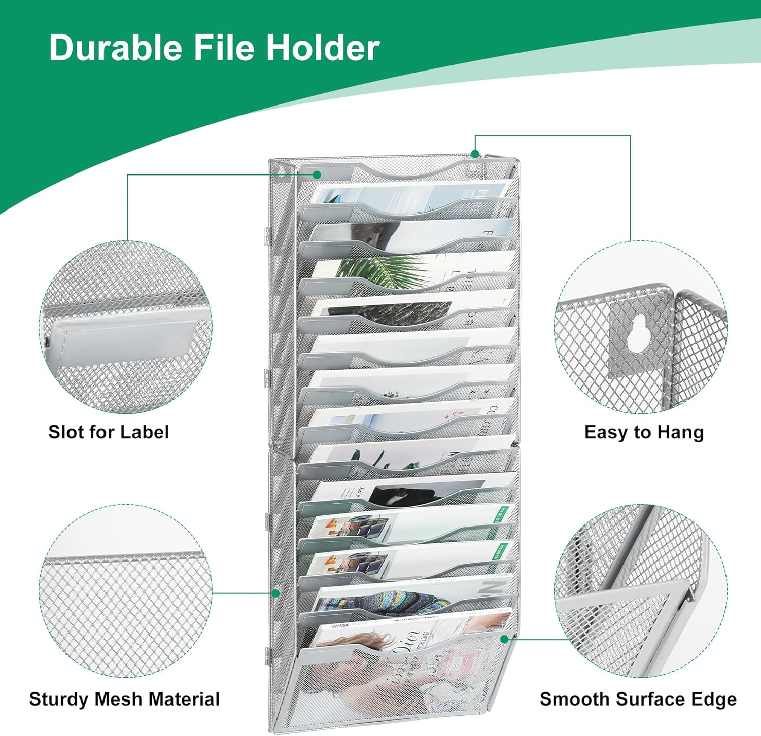 14-Pocket Wall File Organizer, Hanging Mail Organizer Wall Mounted Paper Document Holder, Metal Clipboard Storage Basket for Office Home School Organization, Silver