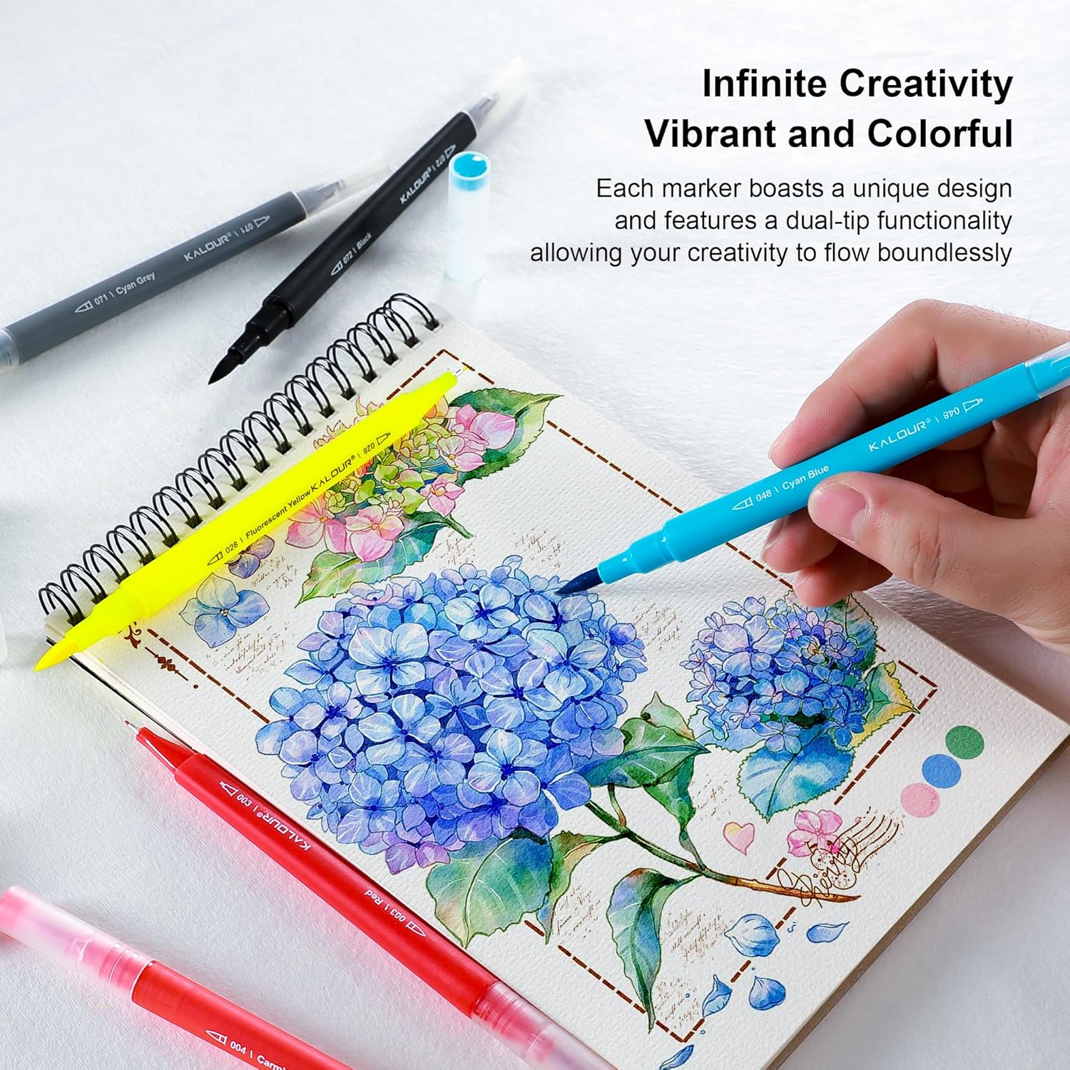 KALOUR 72 Art Markers Pens Set, Dual Tip Brush and Fine Point, Color Number and Name, Zipper Case, Adult Coloring, Lettering, Drawing